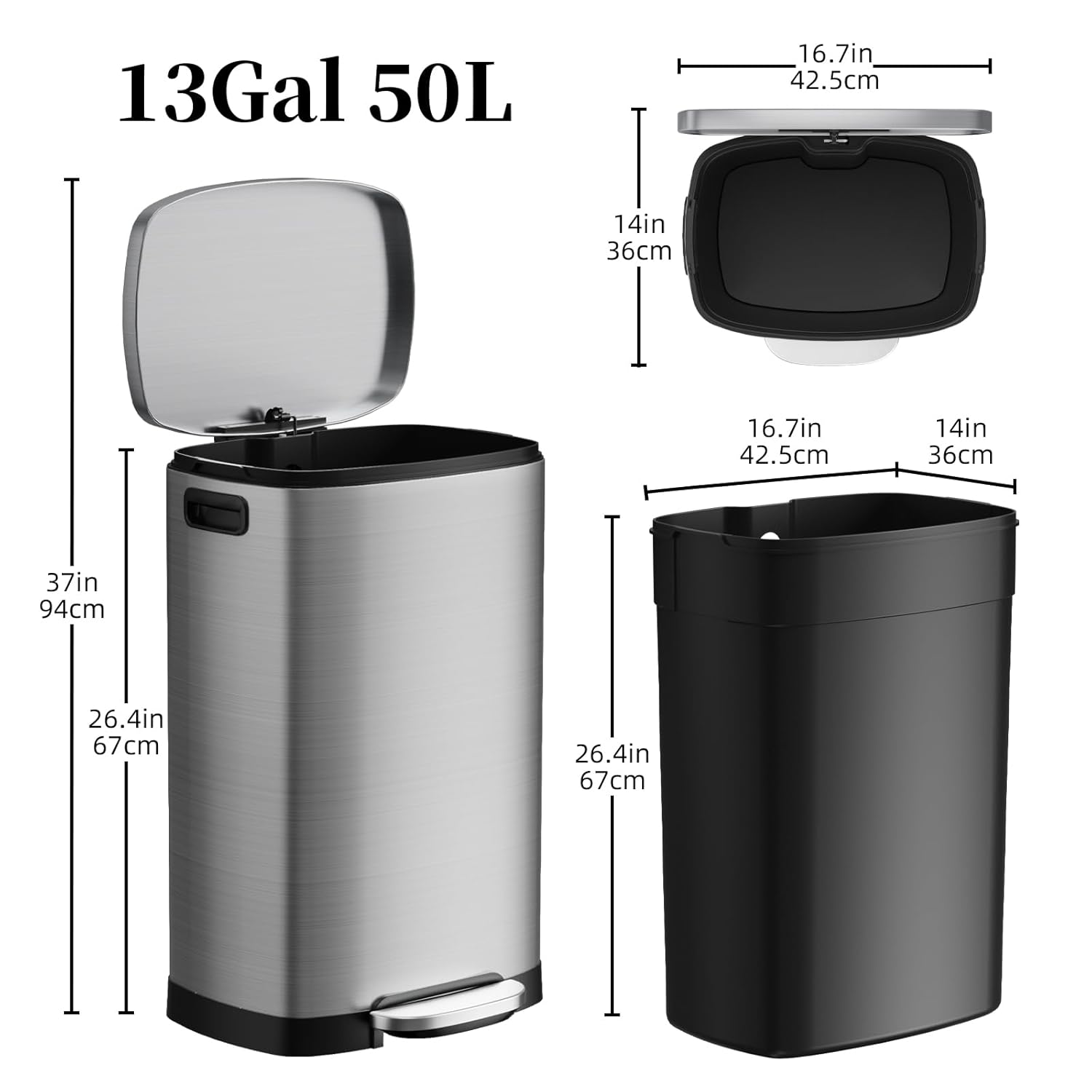 - 【High Quality Construction】13 Gallon Garbage can made of sturdy stainless steel with brushed surface, anti-fingerprints and easy to clean. ABS handle and base, anti-slip design.Pedal tested 200,000 times, service life over 25 years.
