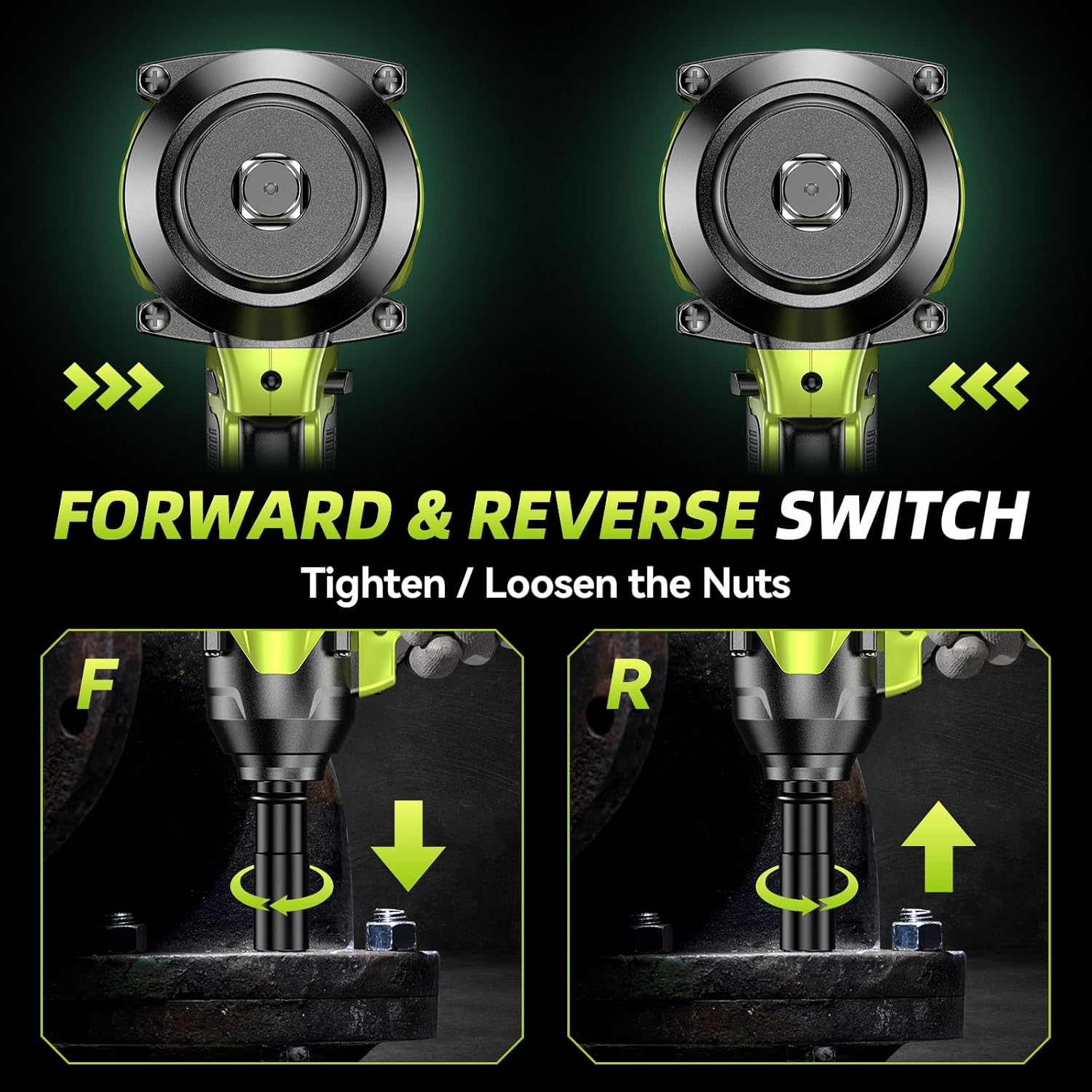 - Bidirectional and Smart Auto Stop: Easily switch between tightening and loosening modes with the forward/reverse switch. When in reverse, the smart brake mechanism activates to prevent the nut or bolt from accidentally falling off. The safety lock prevents accidental activation for added protection