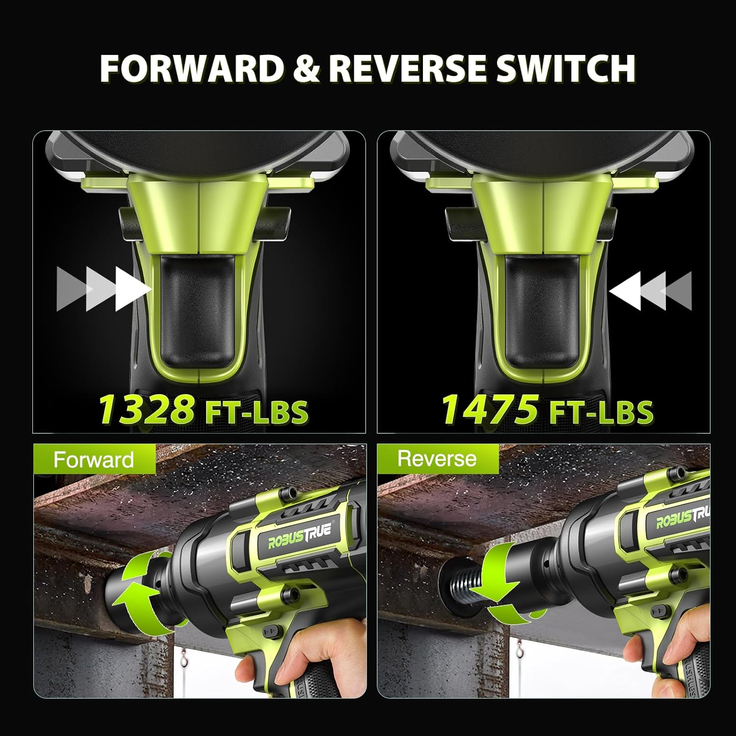 - 3 Torque Levels and Variable Speed Trigger: Robustrue Impact Gun is an essential tool for increased speed and accuracy control of your work. In forward mode, 4-speed controls (0-950RPM/1150RPM/1400RPM/1800RPM) are available via the switch button on the control panel. The speed can be increased by applying more pressure to the variable speed trigger. The choice of different torque levels effectively reduces the risk of over-tightening or stripping fasteners