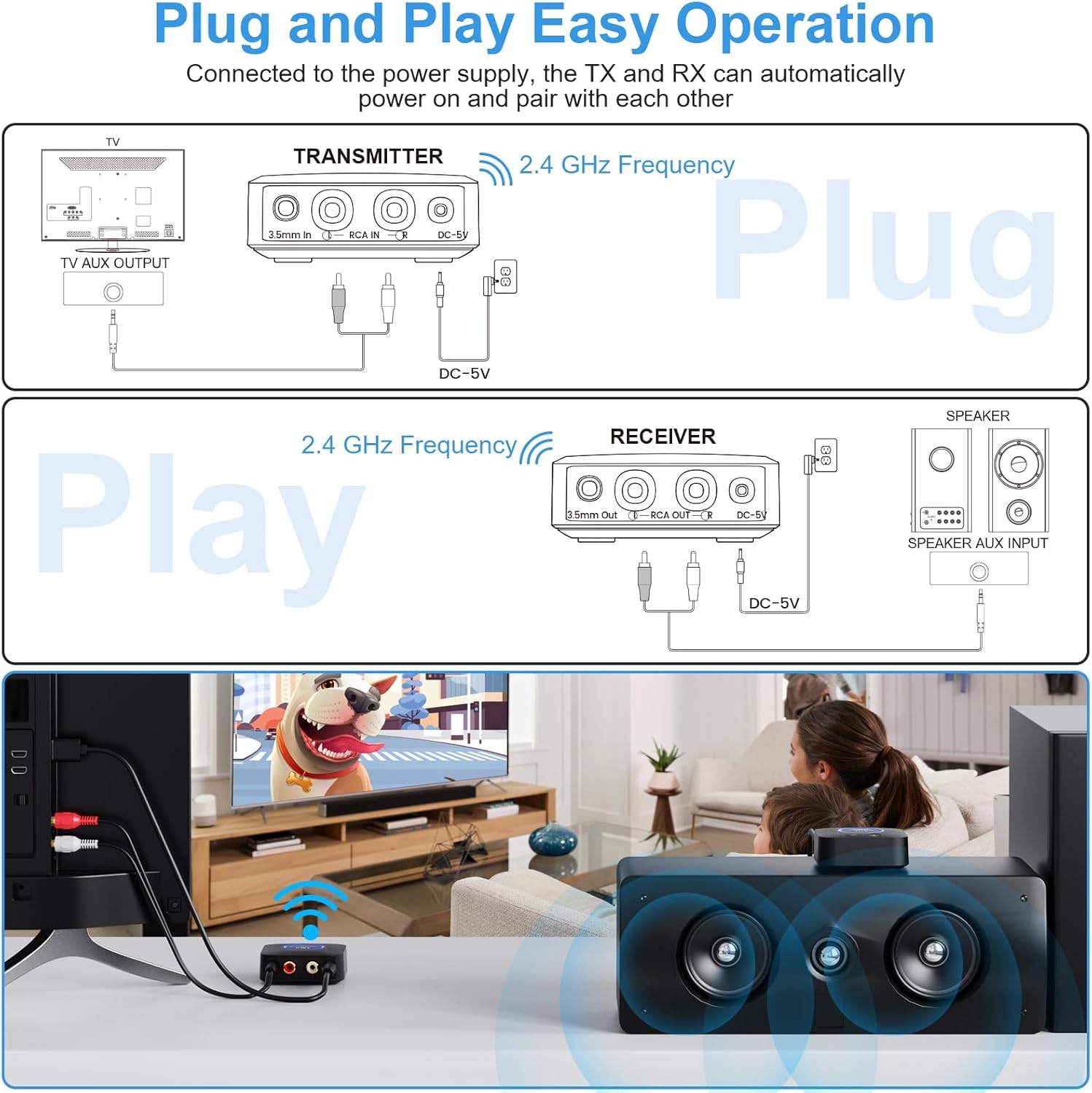 - 【2.4GHz Hi-Fi Audio Enjoyment】The audio adapter kit features 2.4GHz true wireless connection, no more cords, freely enjoy high fidelity music. Very suitable for home TV, PC, MP4 office audio speaker connection, get rid of distance limitation and enjoy high quality stereo streaming audio at every corner of your home. Please NOTE: the audio kit is not suitable for subwoofer.