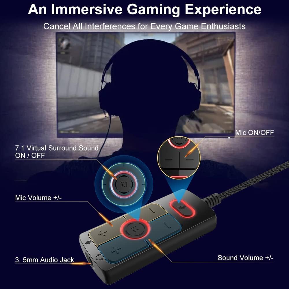 - 【Multi-Function Controller】-You can freely adjust the volume of the microphone and earphones to adapt to different scenarios. You also can quickly mute the mic with the microphone mute button. Unique LED indicator design makes it easier for you to identify the on and off of 7.1 virtual surround sound and microphone mute function.