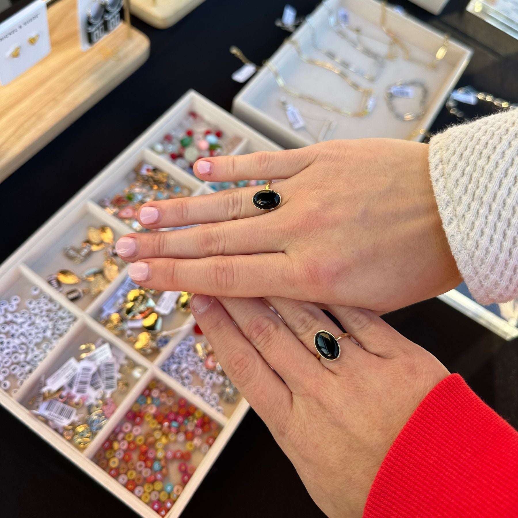 This ring features an oval black glass stone as a statement detail with a 14k plated band. This statement and edgy ring is the perfect compliment to any outfit.