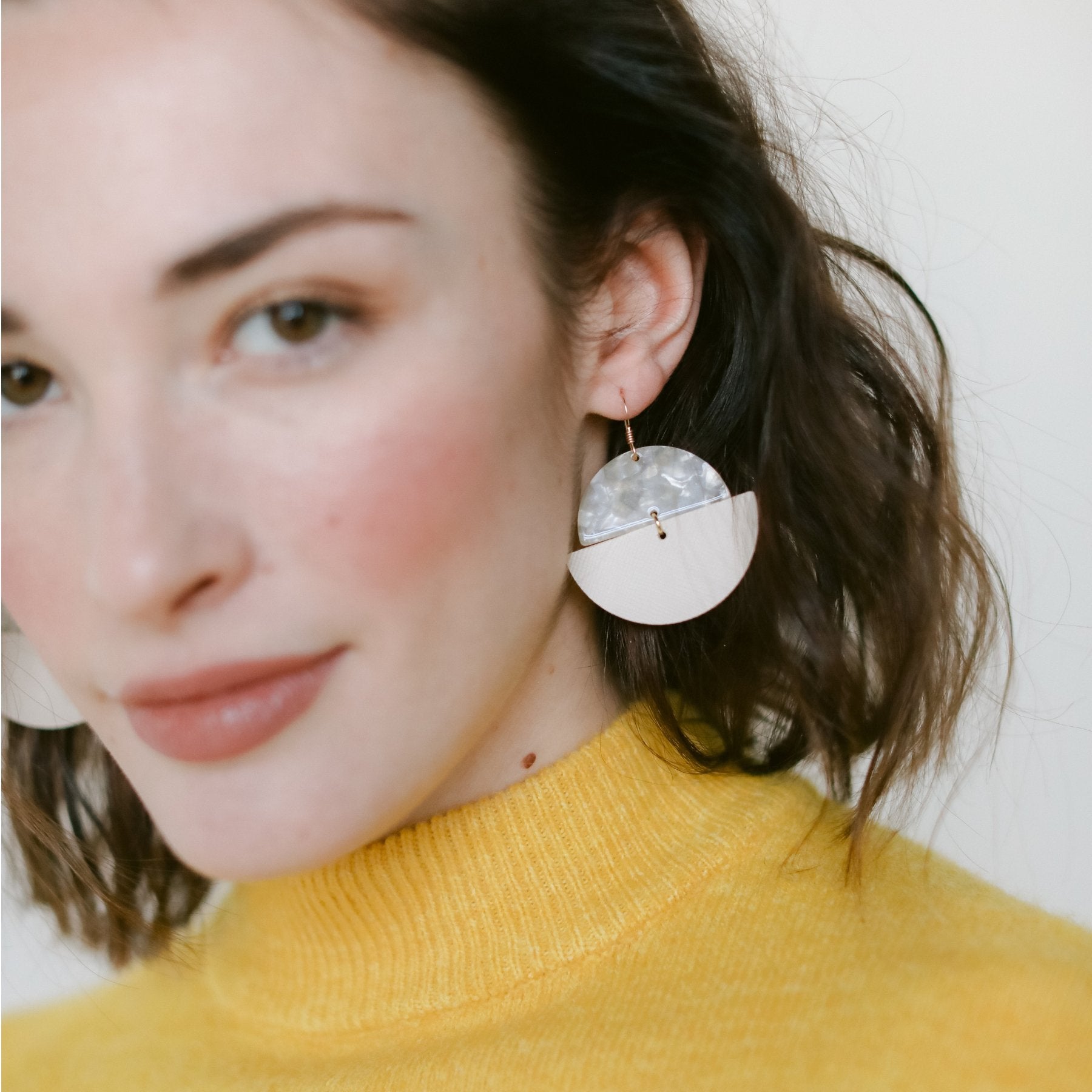Versatile leather earrings simple enough to match any outfit. Our Blank Canvas Lunas are made with an ivory resin piece and taupe leather. If you're looking for neutral lightweight earrings for fall, these are perfect for you.