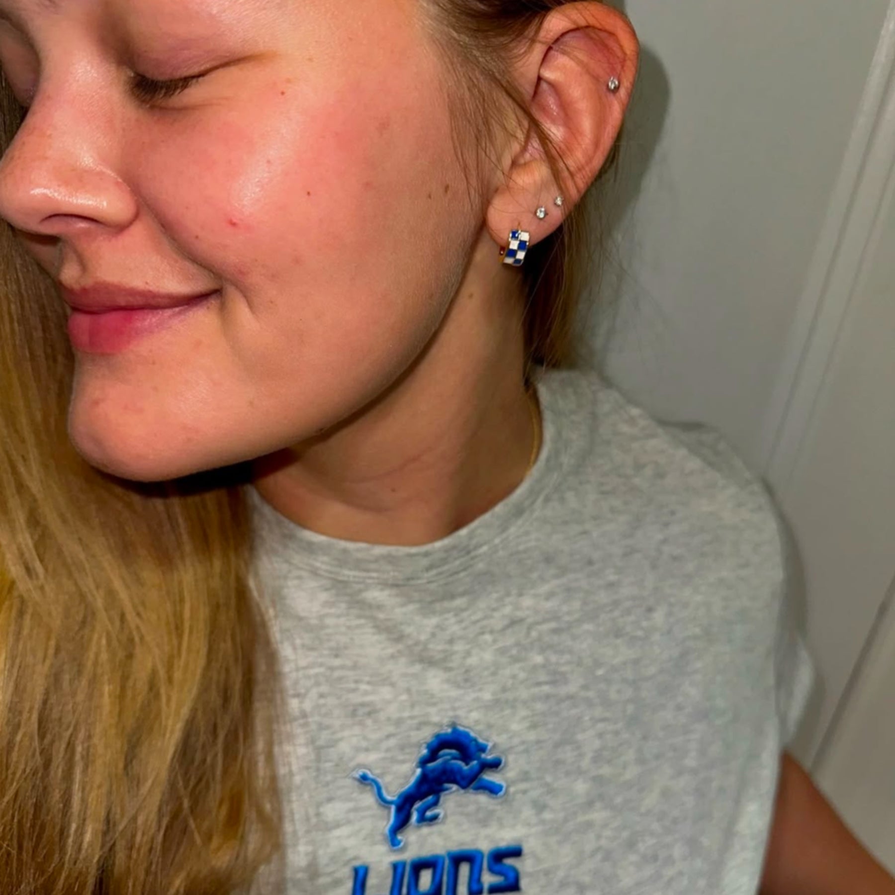 The blue and white checkered enamel huggies are a wide, small gold hoop with blue and white enamel that fits closely to the ear. They feature a hinge closure for comfort and wearability.