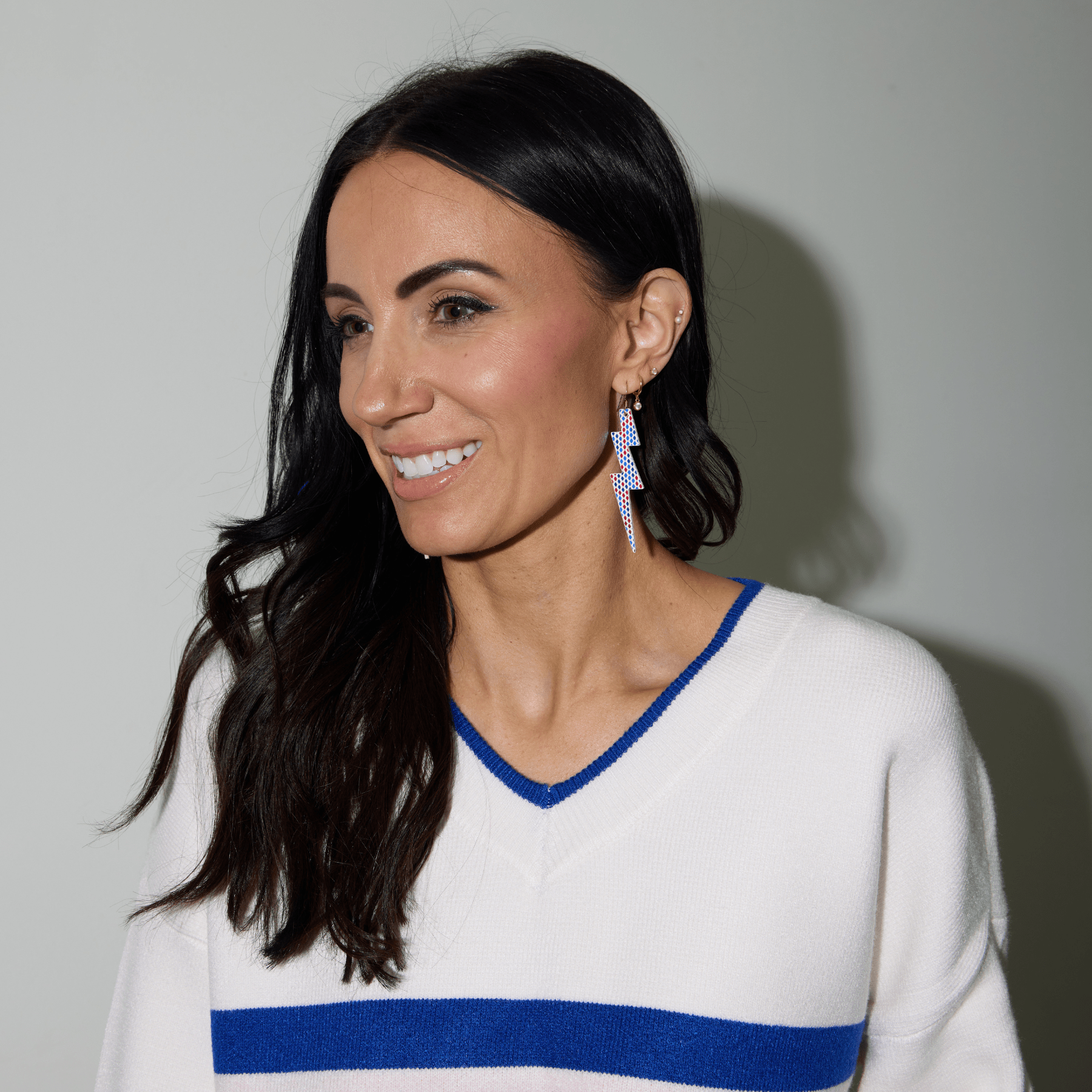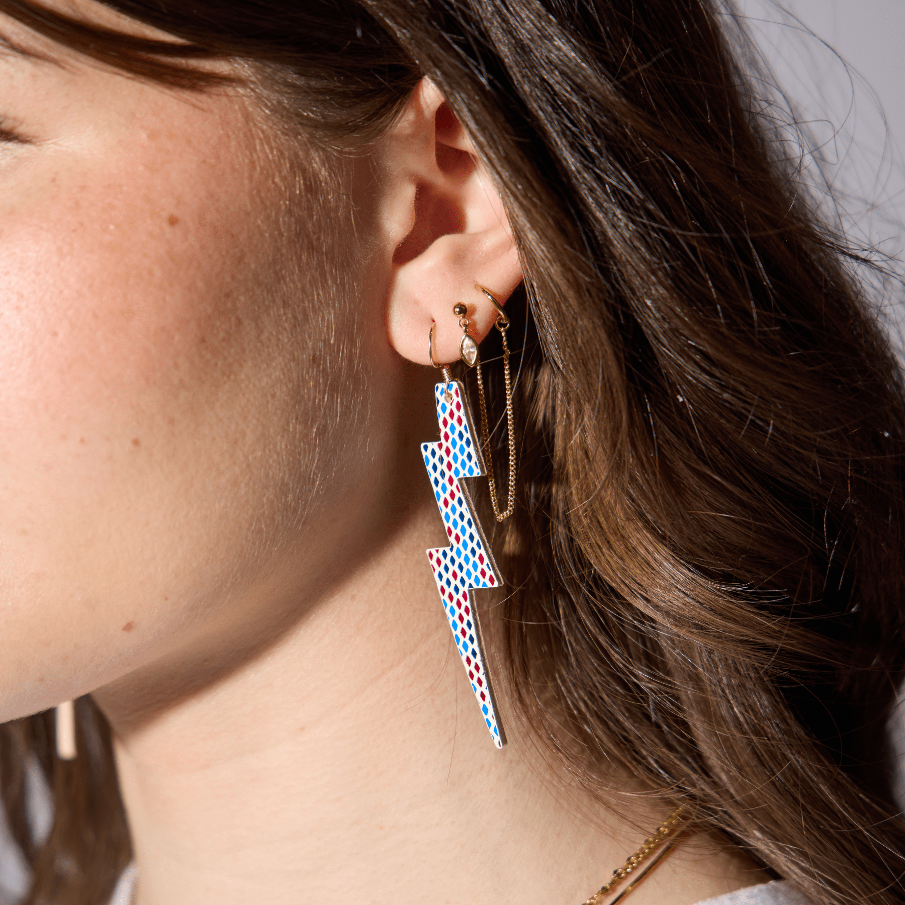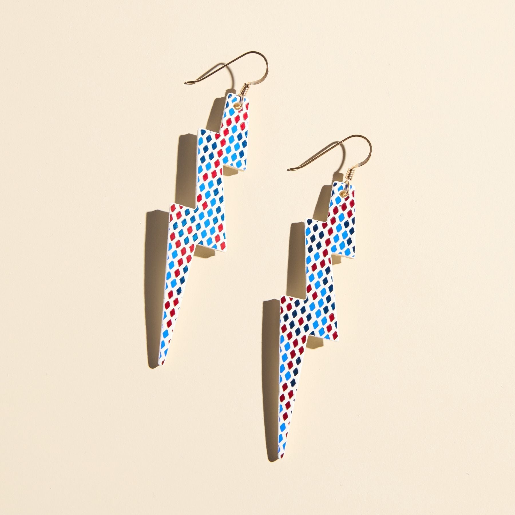 Get Thunderstruck with our Buffalo Lightning Bolts - our iconic bolt silhouette that features our smooth white leather with hand-stamped metallic red and blue foil in a snake-skin pattern.