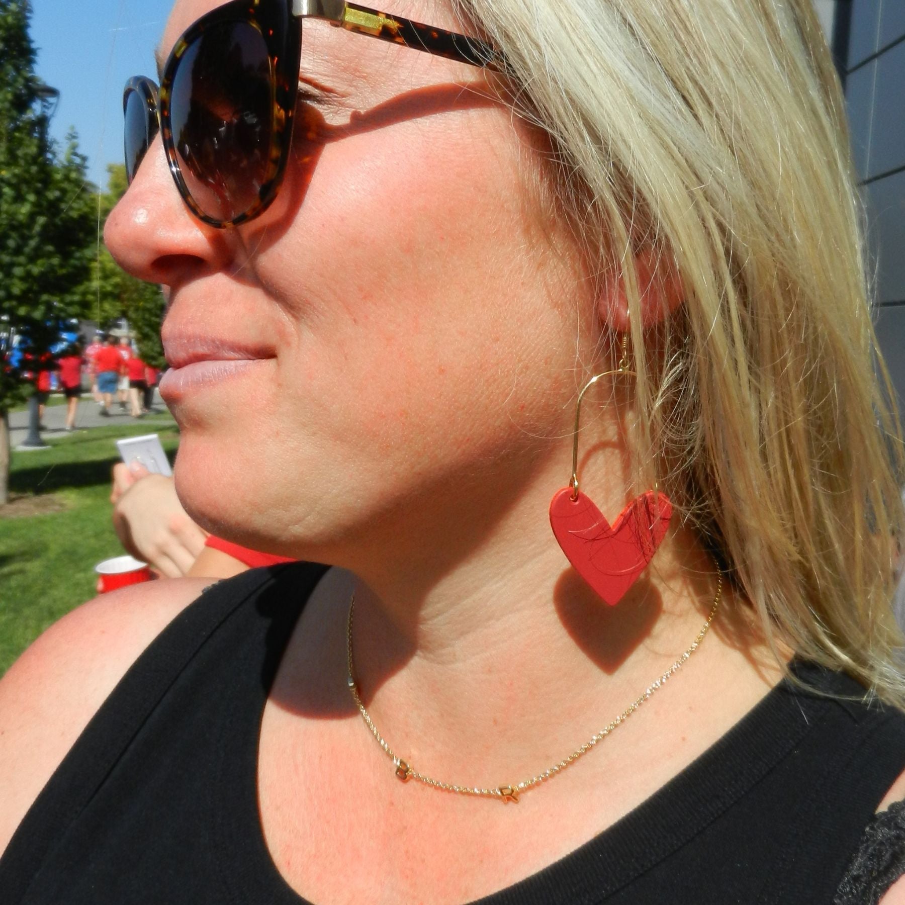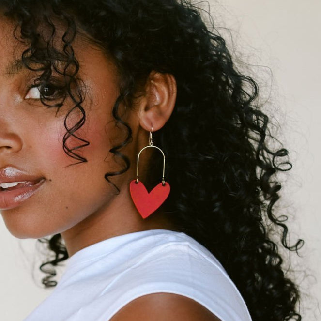Crimson Sweethearts feature our smooth, vibrant red leather in our patented heart statement shape. These lightweight statement earrings are attached to gold or silver hoop hardware for optimum shine and weightlessness.