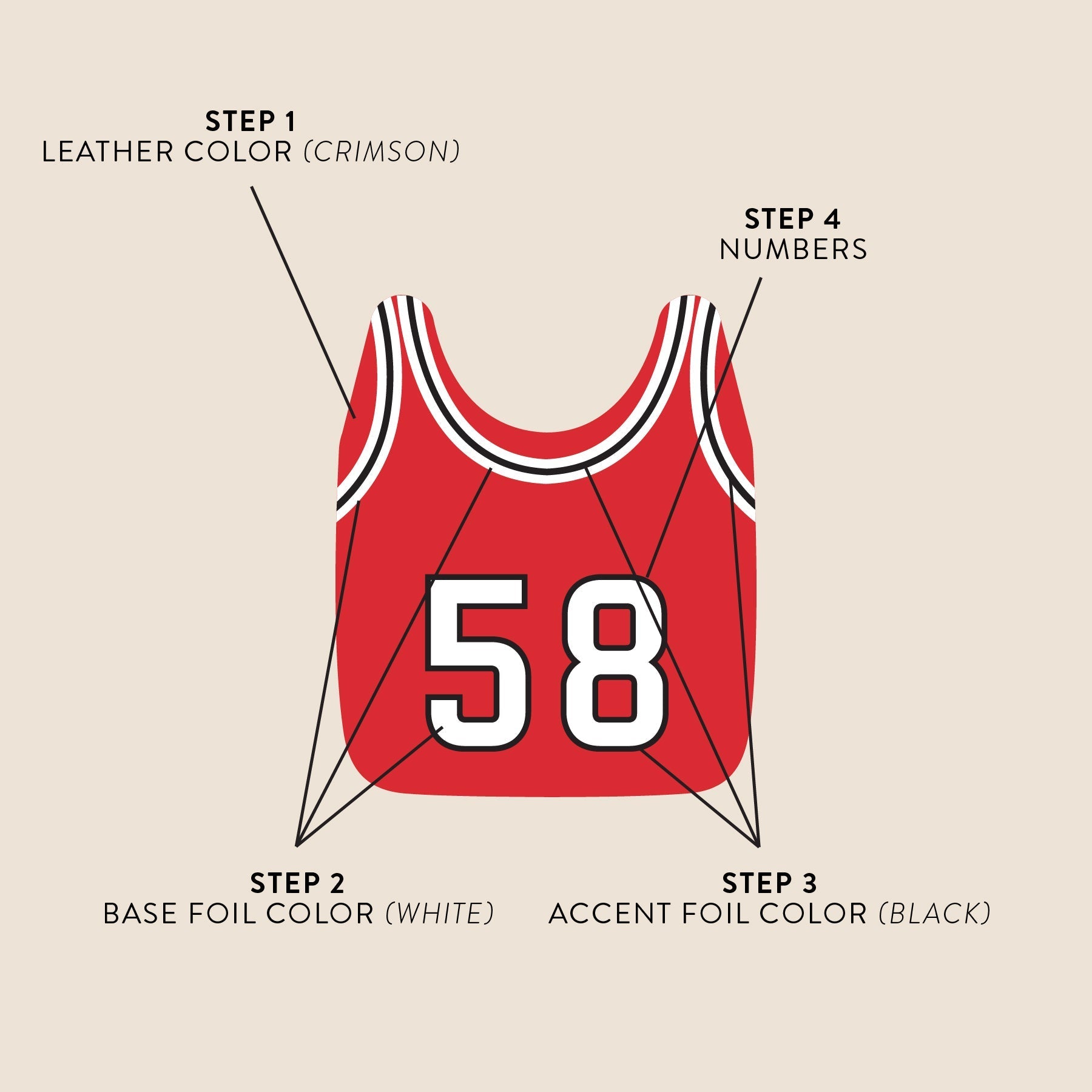 Please follow the steps on the graphics provided to ensure your custom jerseys will be made correctly. If you have questions, please reach out to info@nickelandsuede.com. You can send an inspiration photo for more design help.
