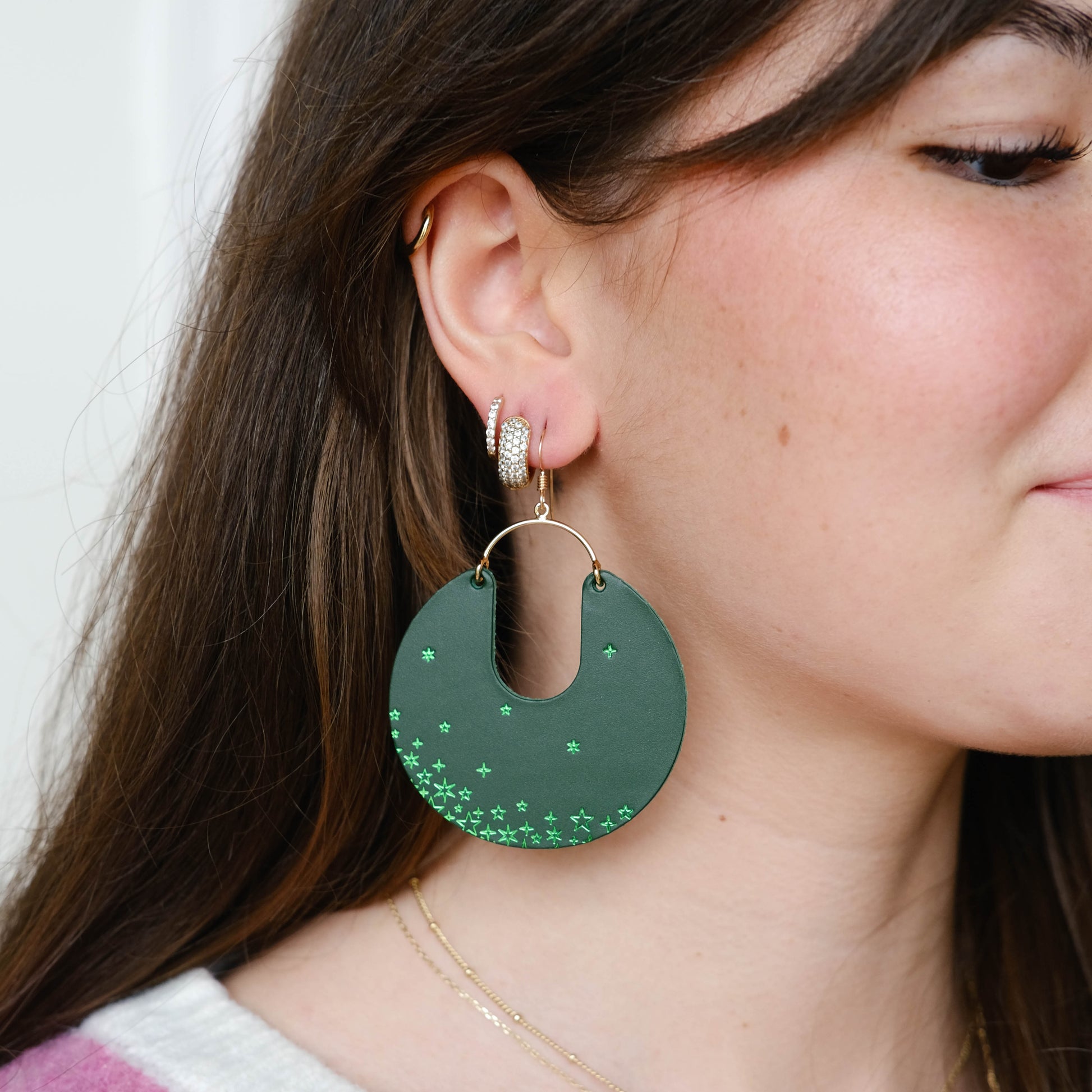 Get ready to create a starry statement and capture the essence of the holidays with these green foiled Evergreen Starscape Leos. Create a shimmery, eye-catching look with this bold accessory.