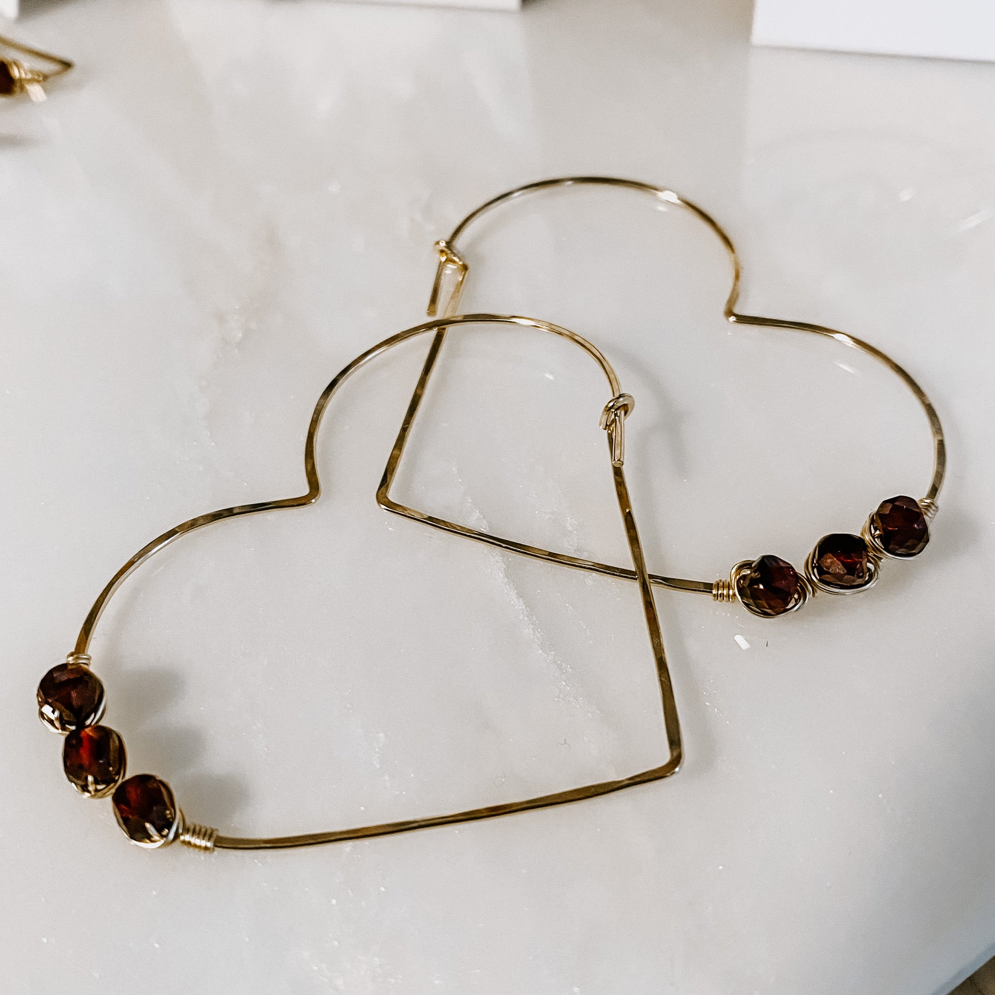 Hand shaped and hammered heart shaped threader earrings- perfect for Valentine’s Day, bridal events and beyond! These are adorned with wire wrapped garnets- January birthstone.