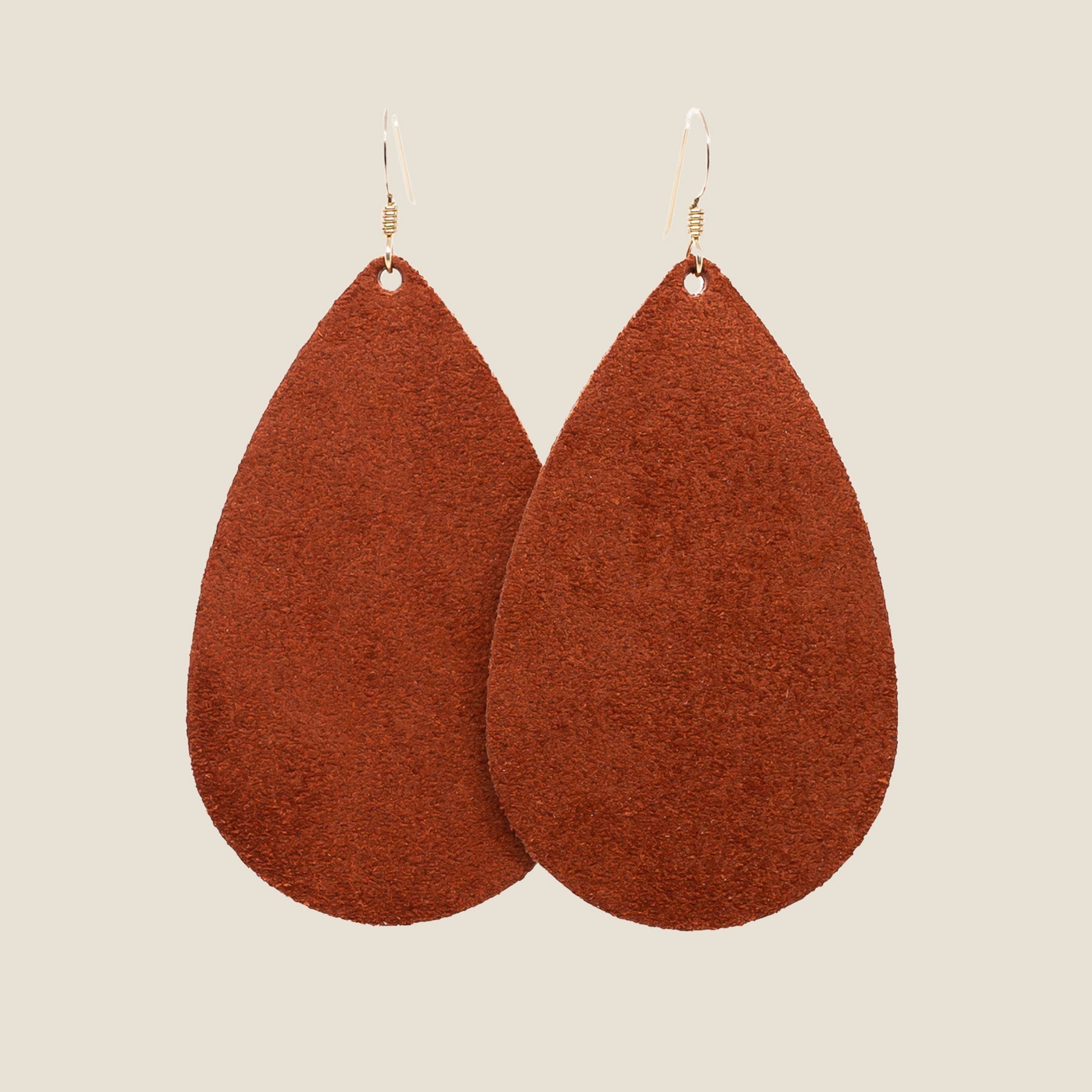 Our iconic Teardrop statement earring is now available in warm ginger suede. This suede has been silicone-treated for water and stain-repellency with an additional clear sealant on the reverse side that helps prevent makeup and face oils from staining the leather.