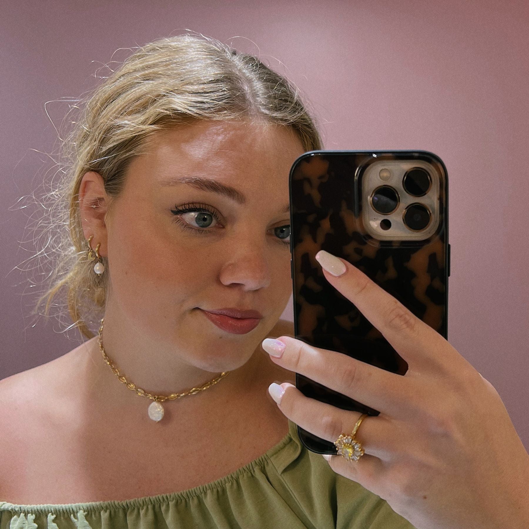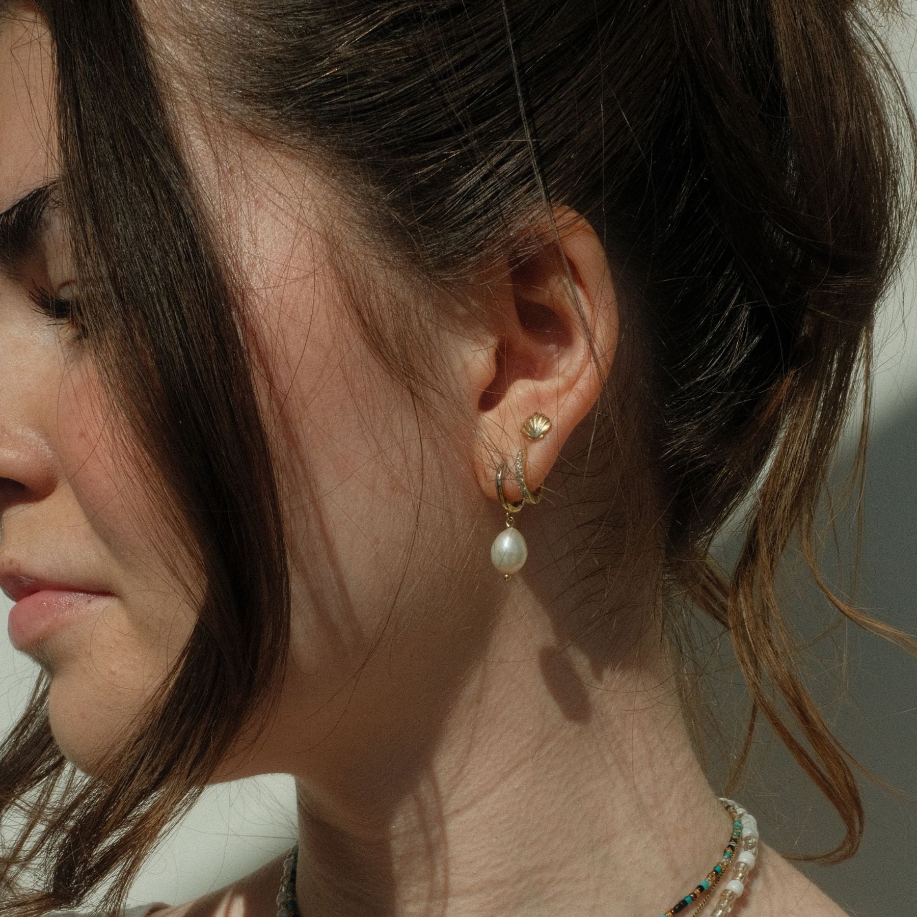 Pearl Drop Huggies feature a cultured pearl attached to a delicate gold huggie hoop with hinged clasps. Due to the organic inspiration behind these earrings, no two pearl accents will be exactly the same.