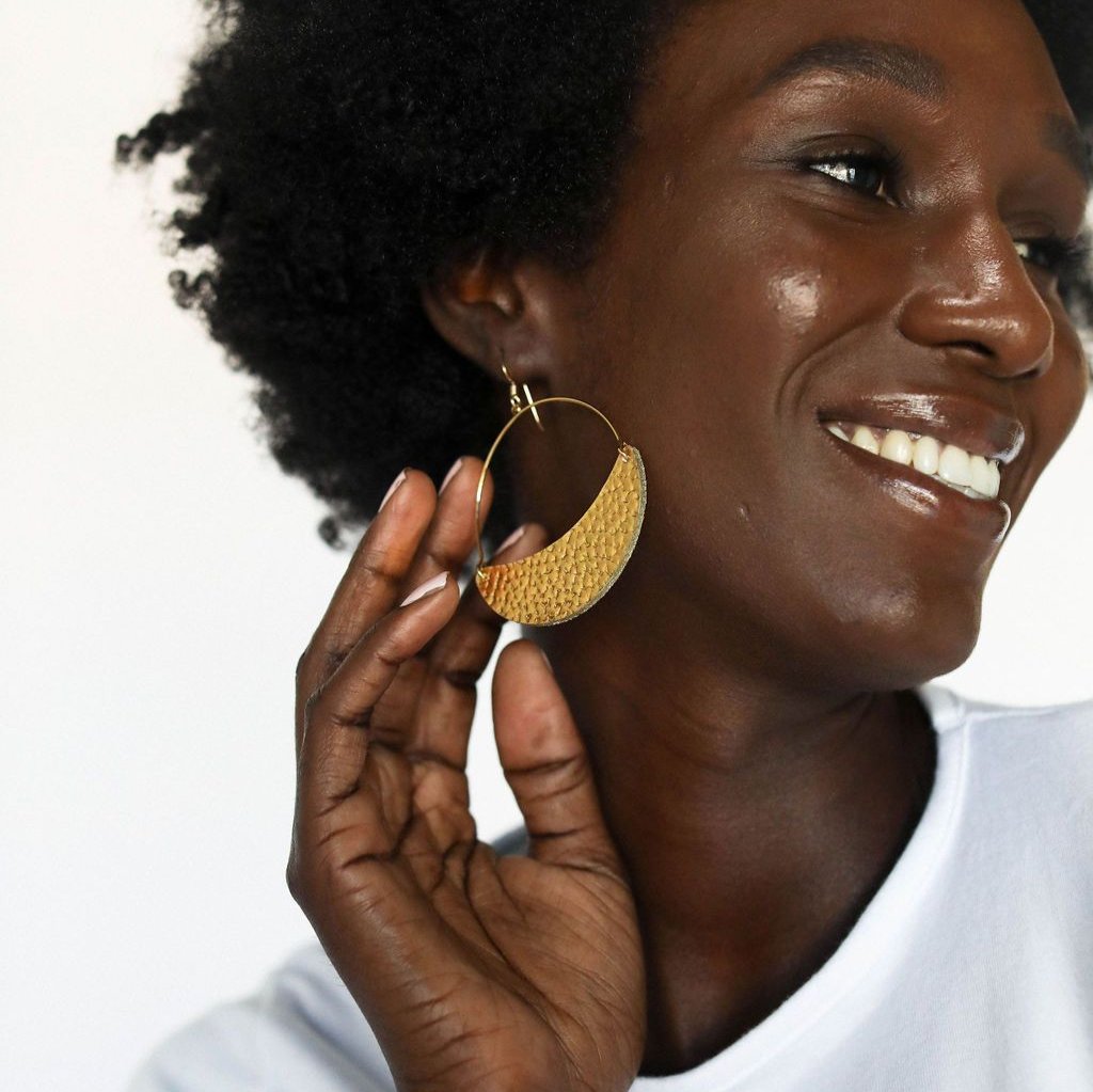 Asters are a lightweight take on the classic hoop earring with a crescent leather accent. This style is crafted from premium textured Hammered Gold leather, with a slight swinging movement and versatile wear-everywhere style.