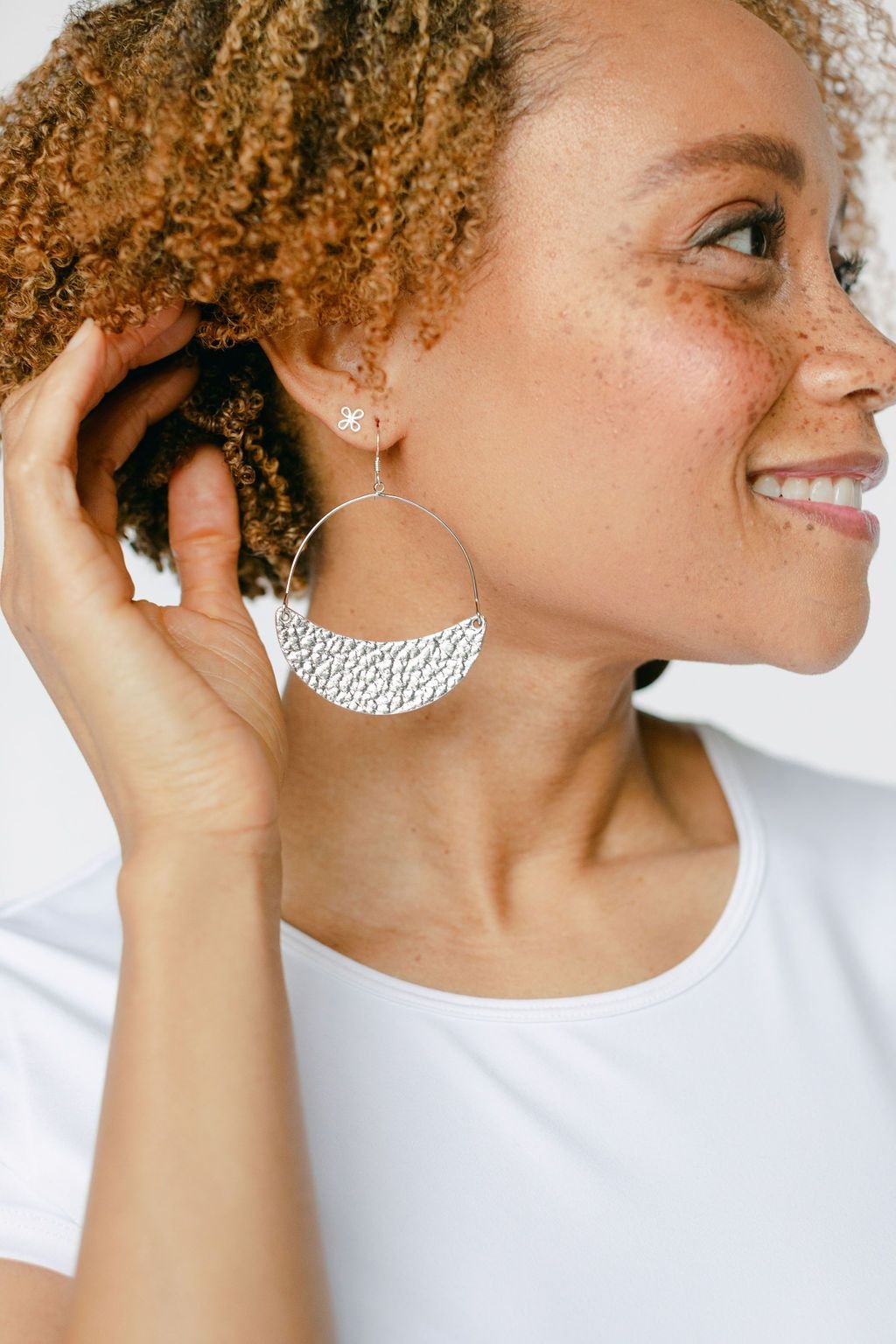 Asters are a lightweight take on the classic hoop earring with a crescent leather accent. This style is crafted from premium textured Hammered Silver leather, with a slight swinging movement and versatile wear-everywhere style.