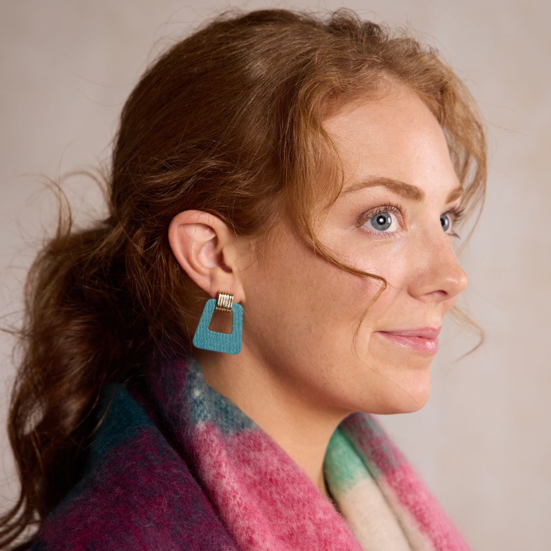 Timeless style meets a modern silhouette with the Avery earrings. This lightweight statement earring is created with our premium firm Harbor Teal leather and a beveled gold or silver stud component.