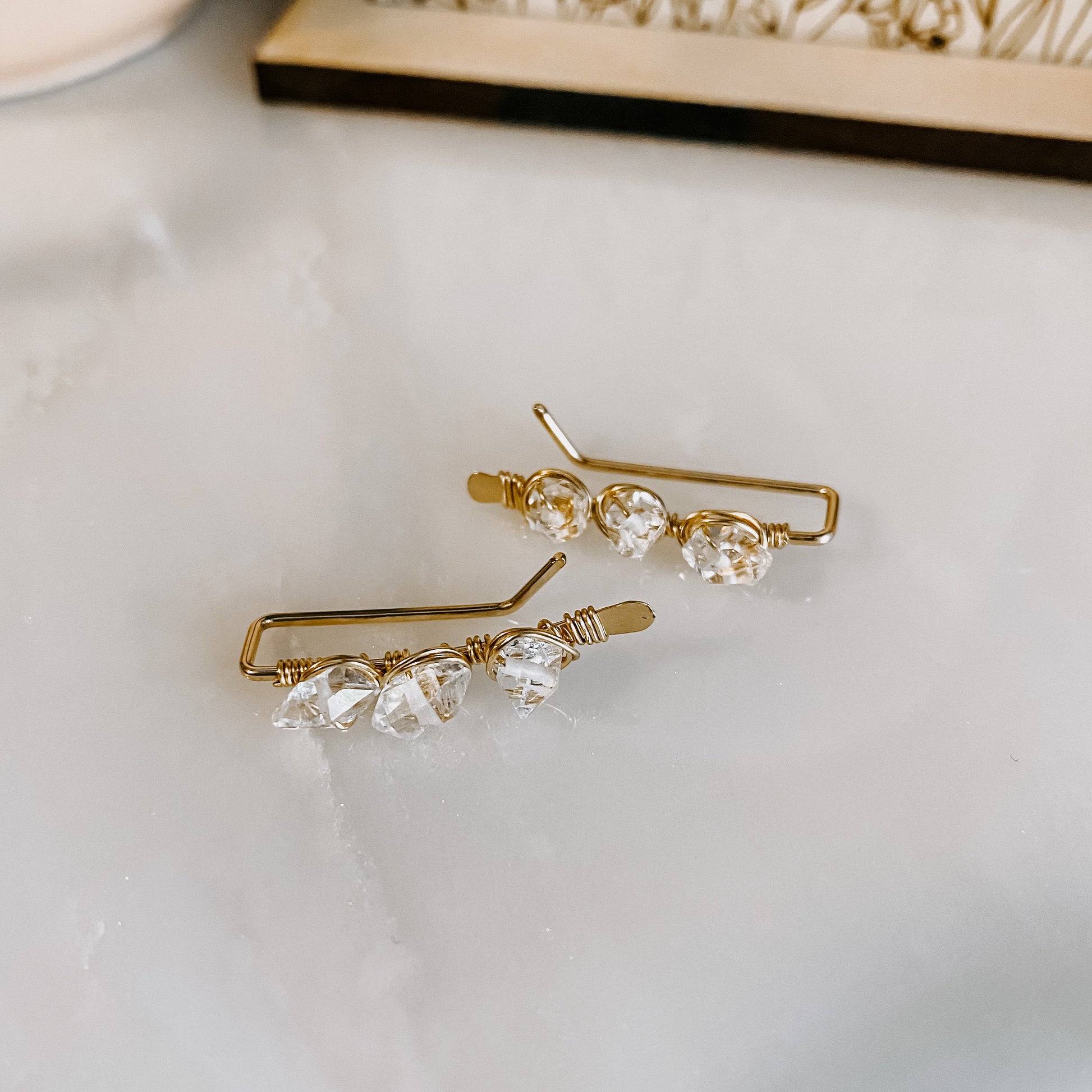 Handmade ear climber earrings, with Herkimer diamonds wire wrapped.