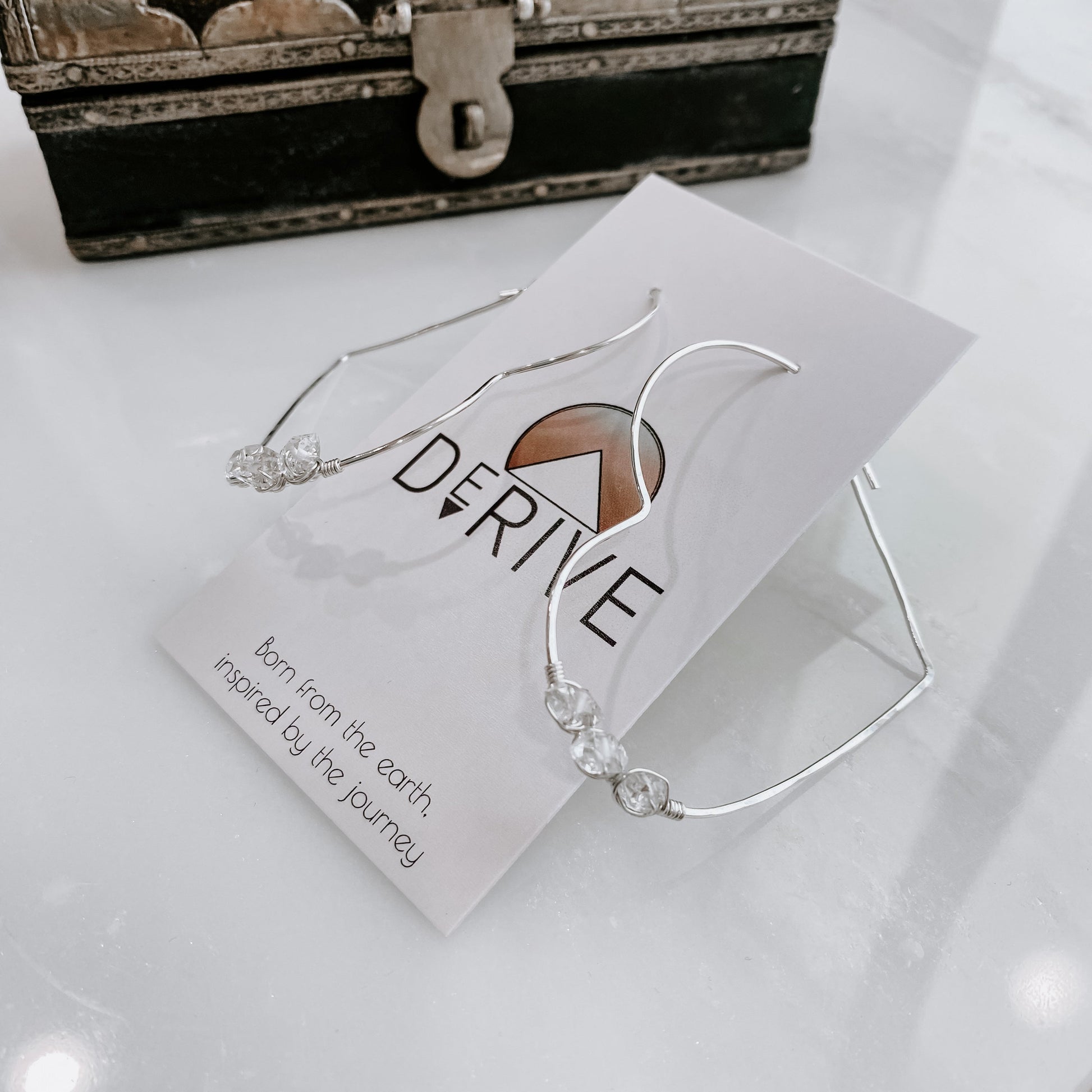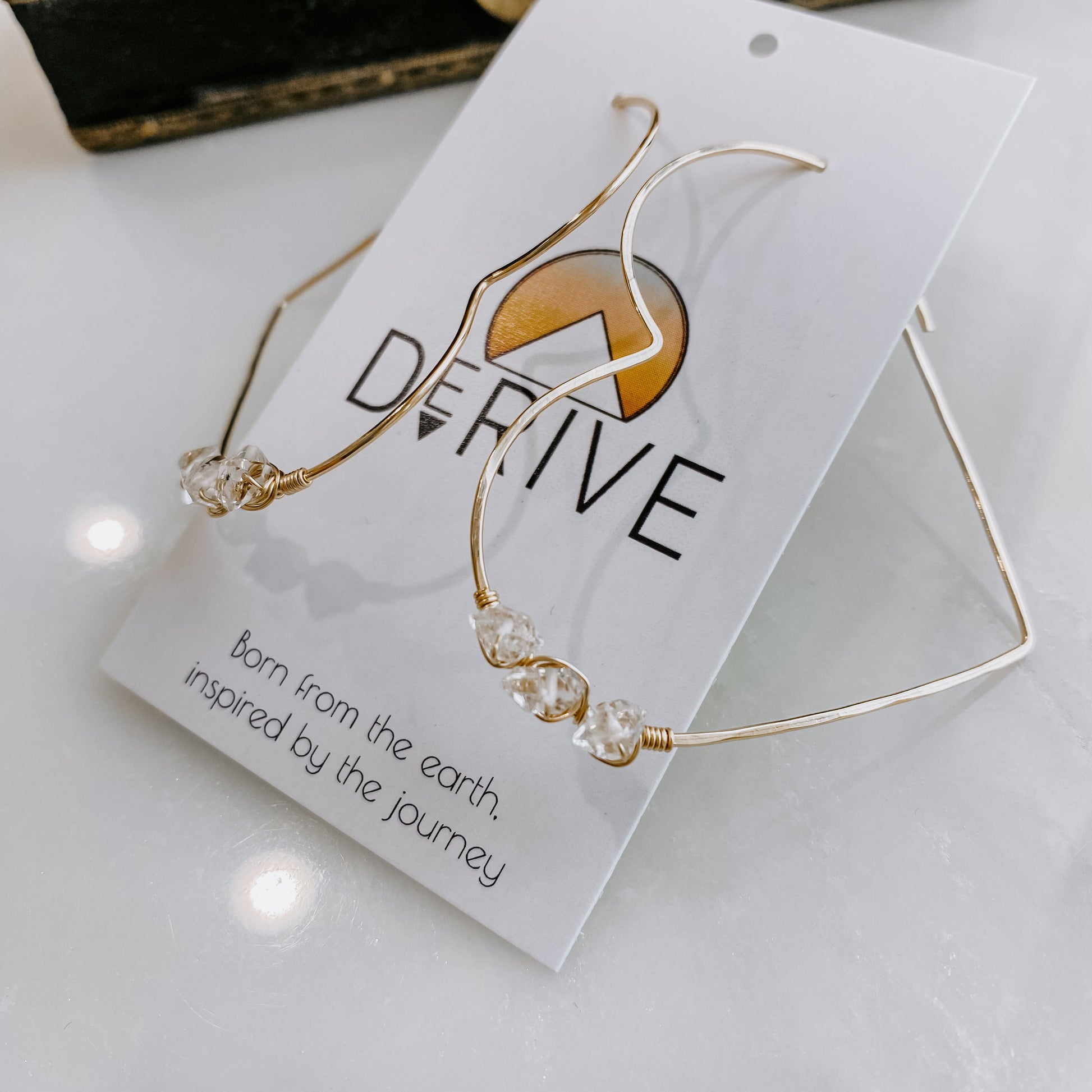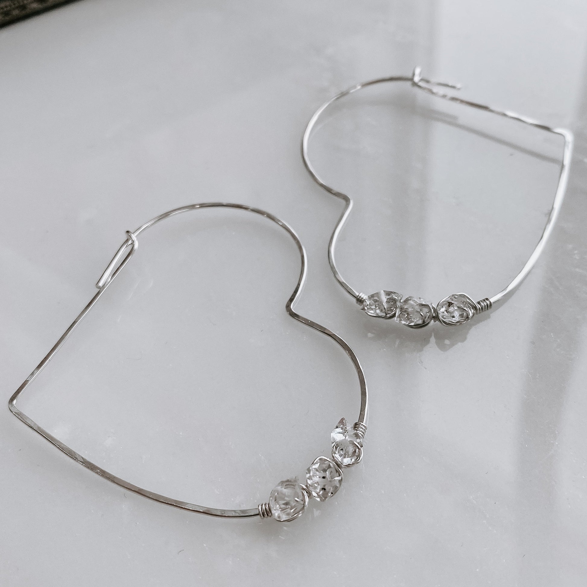 Hand shaped and hammered heart shaped threader earrings- perfect for Valentine’s Day, bridal events and beyond! These are adorned with wire wrapped Herkimer Diamond Quartz.