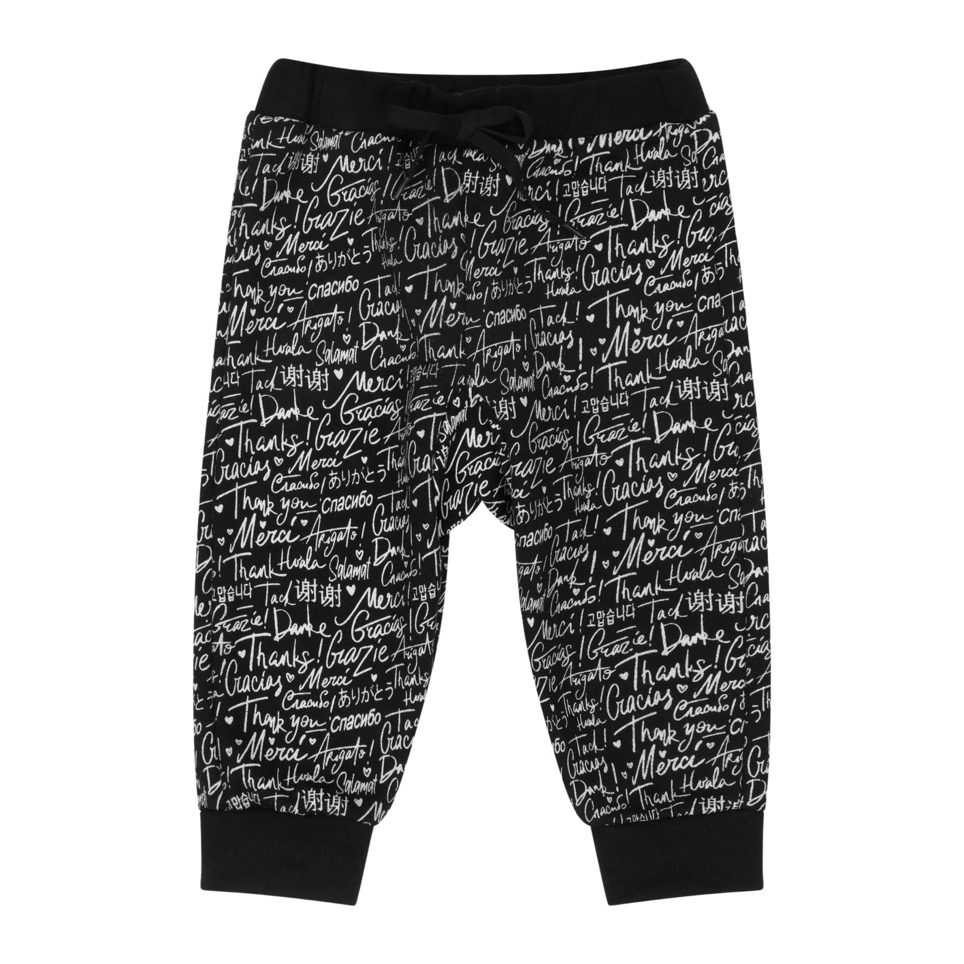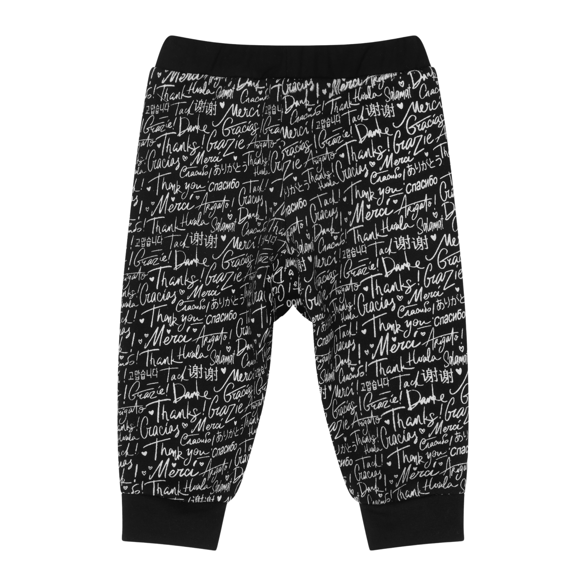 Say thank you in different languages with these comfy infant joggers by Mixed Up Clothing featuring an all over print