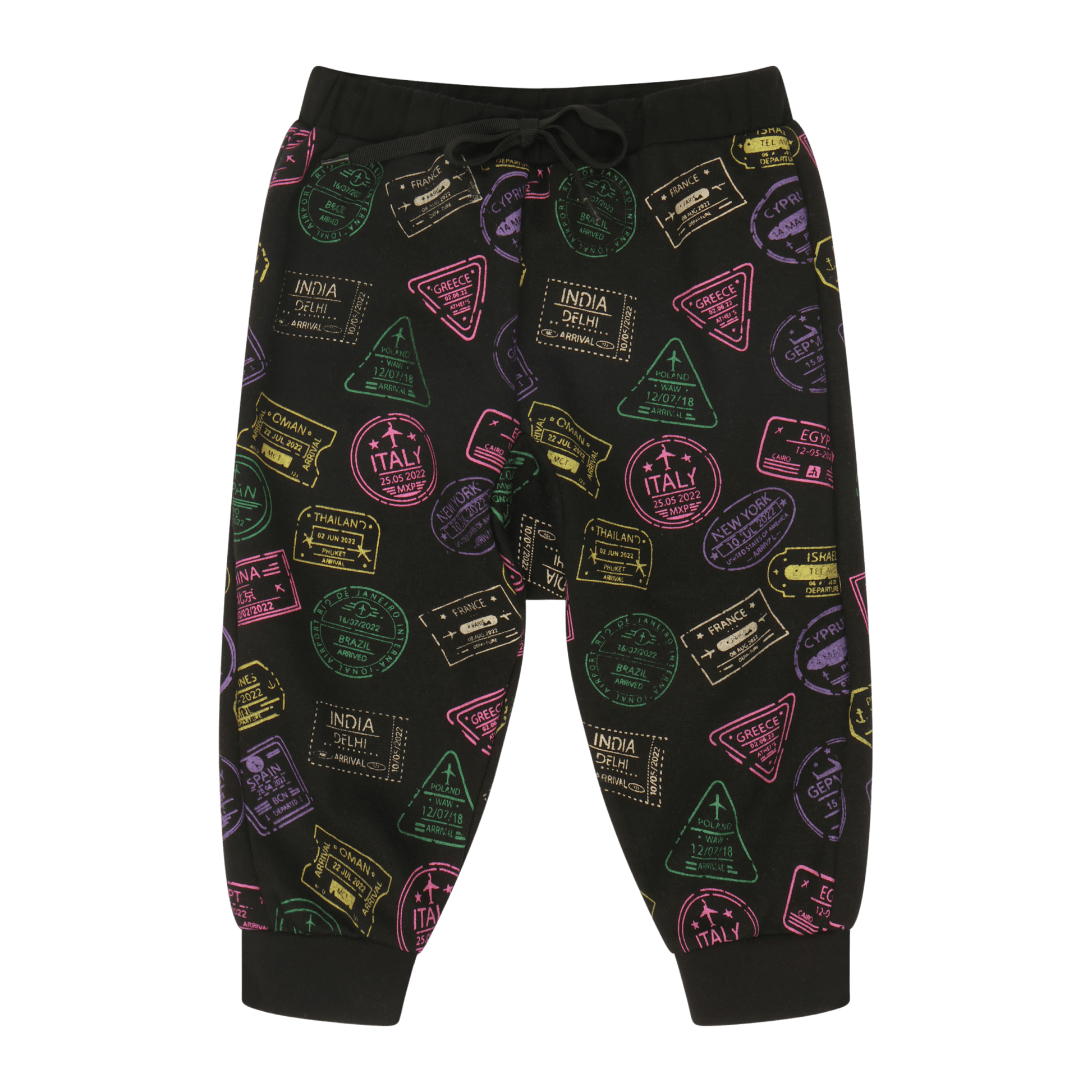 Out of this world cuteness with these comfy infant joggers by Mixed Up Clothing featuring an all over passport stamp print.
