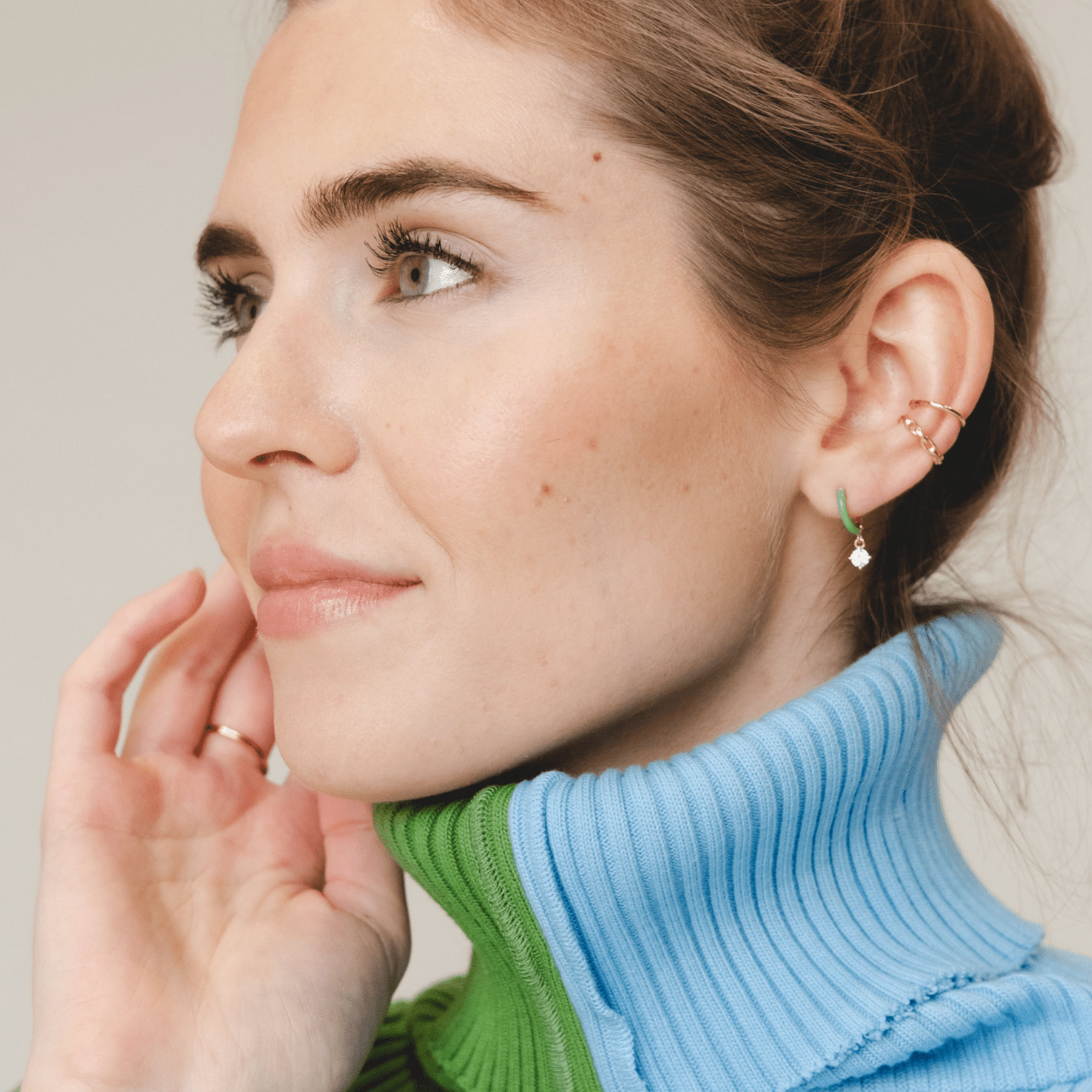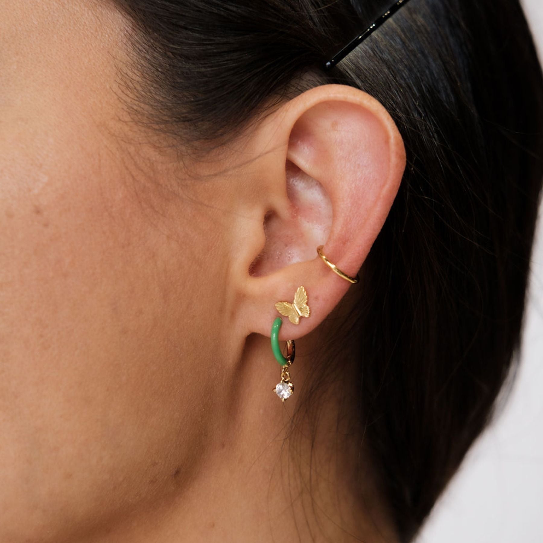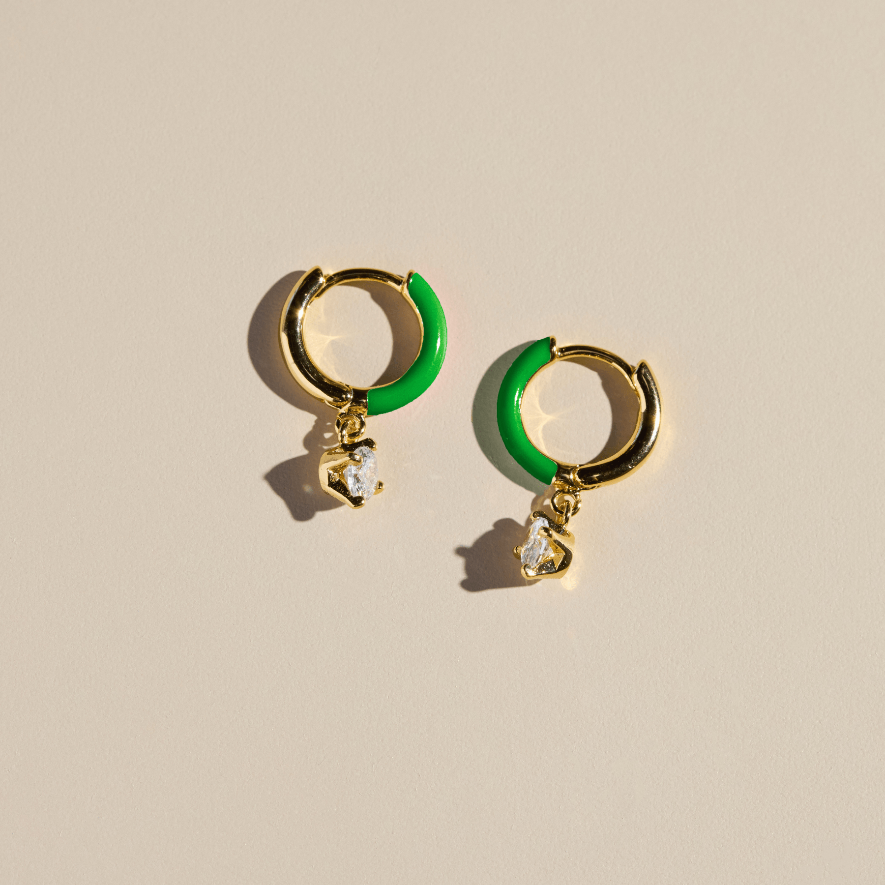 Jade Ellie Huggies are petite, close-hugging hoop earrings made with bright green enamel, a cubic zirconia drop stone accent, and 14k gold-plated hardware. These delicate hoop earrings feature a hinged closure. These lightweight hoops are perfect for casual wear and small enough to wear in a second or third piercing with your favorite Nickel & Suede statement earrings.