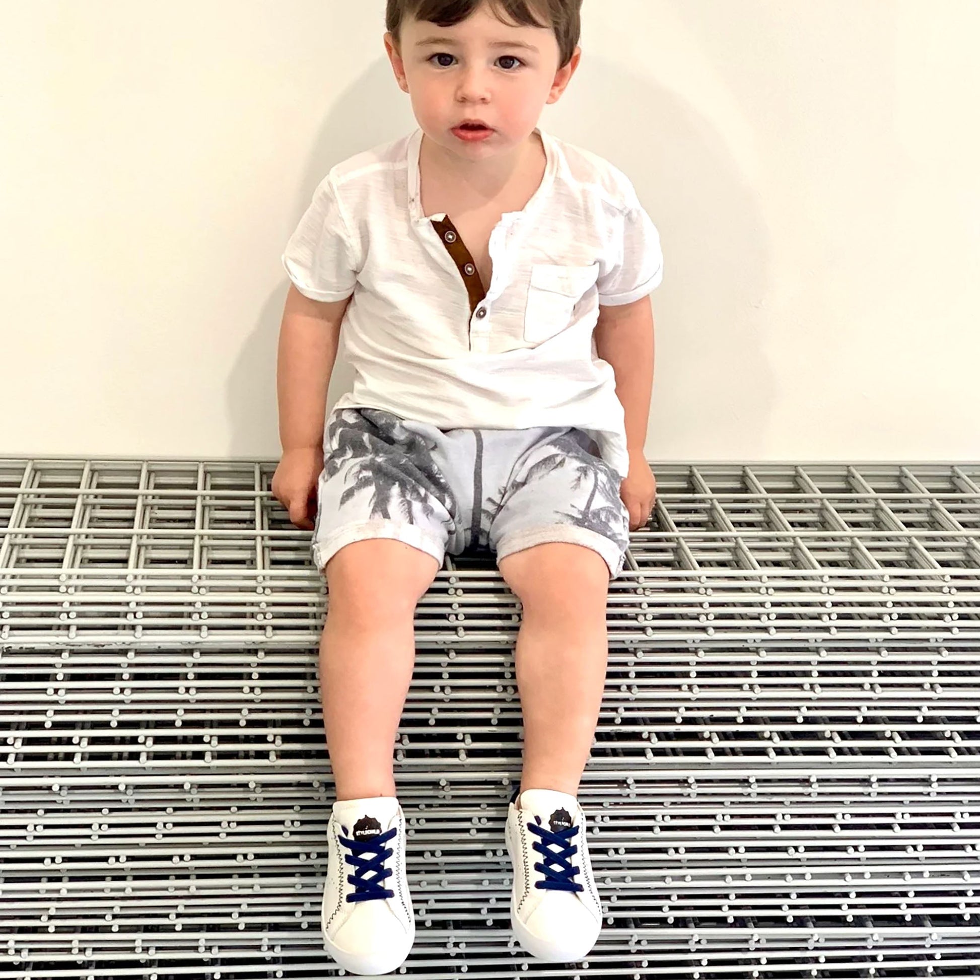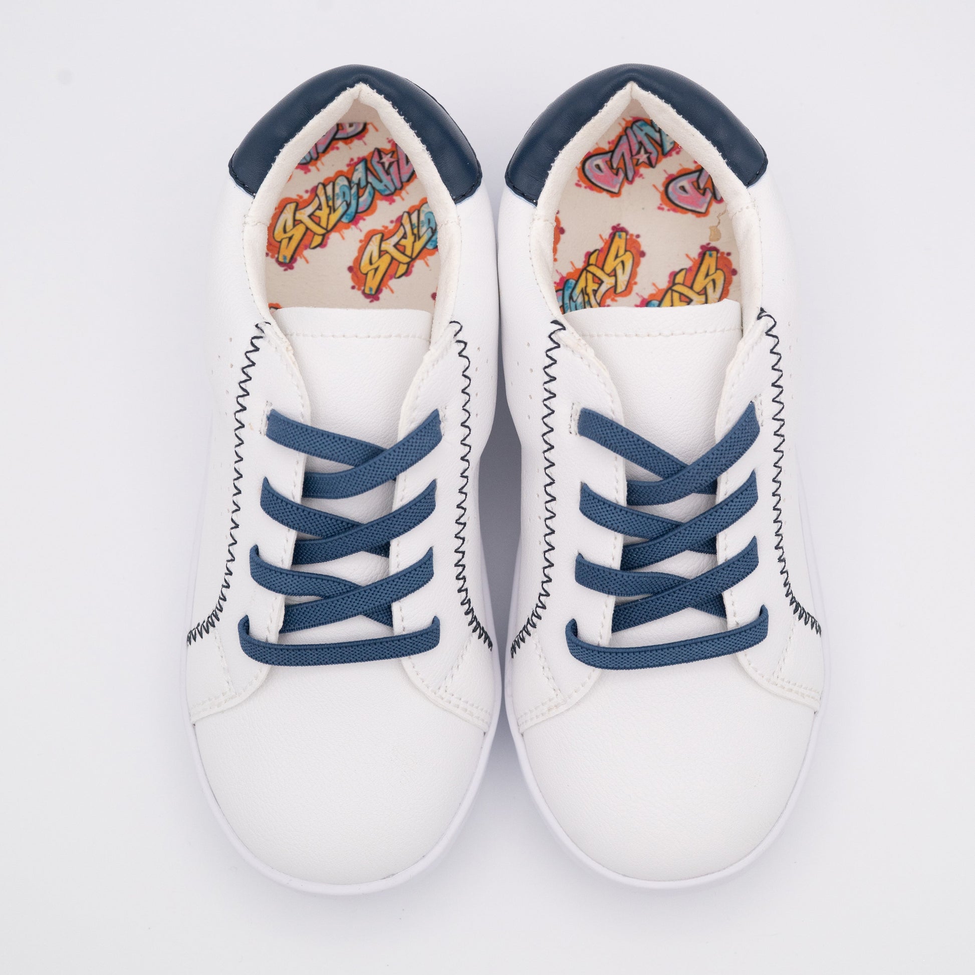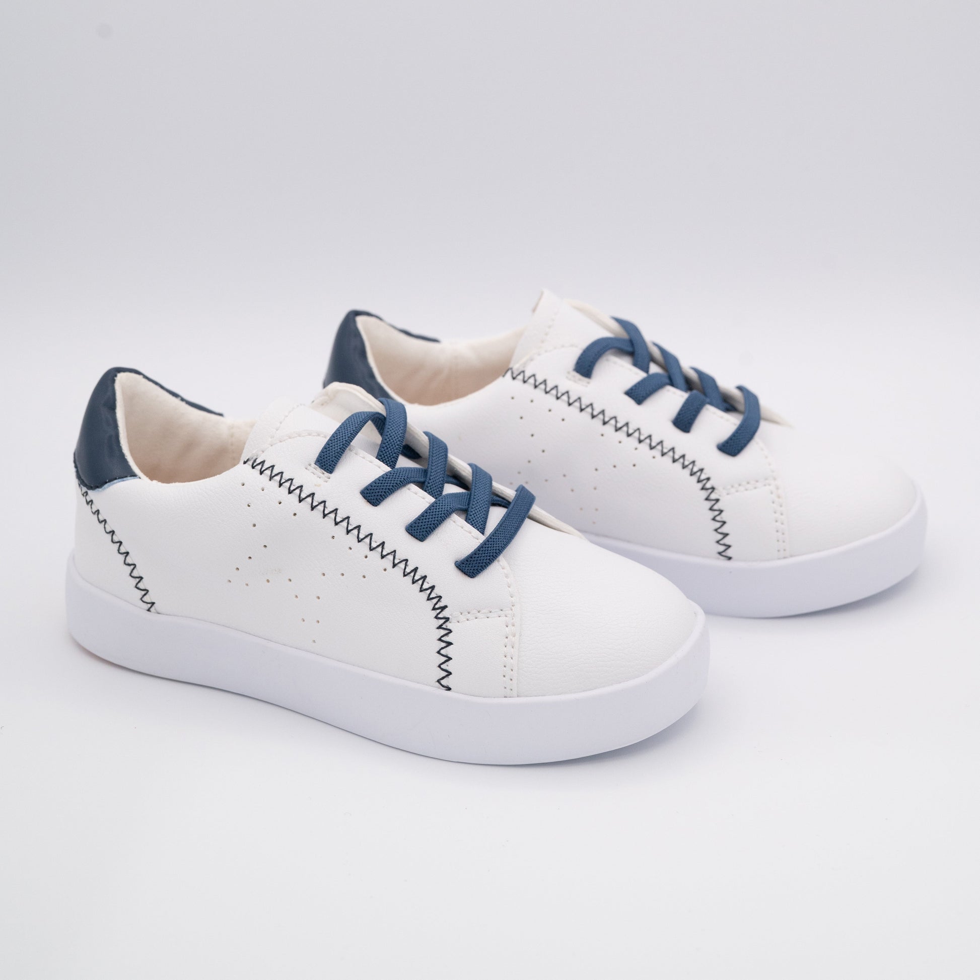 - White leather upper with navy stitching; perforated star on sides and navy heel grip