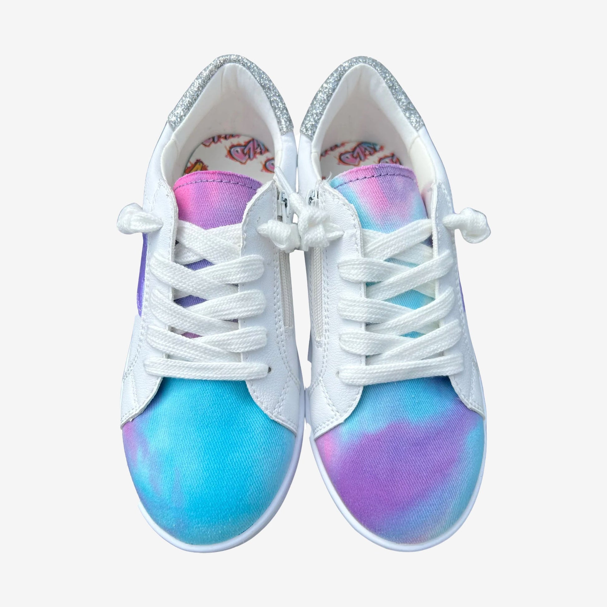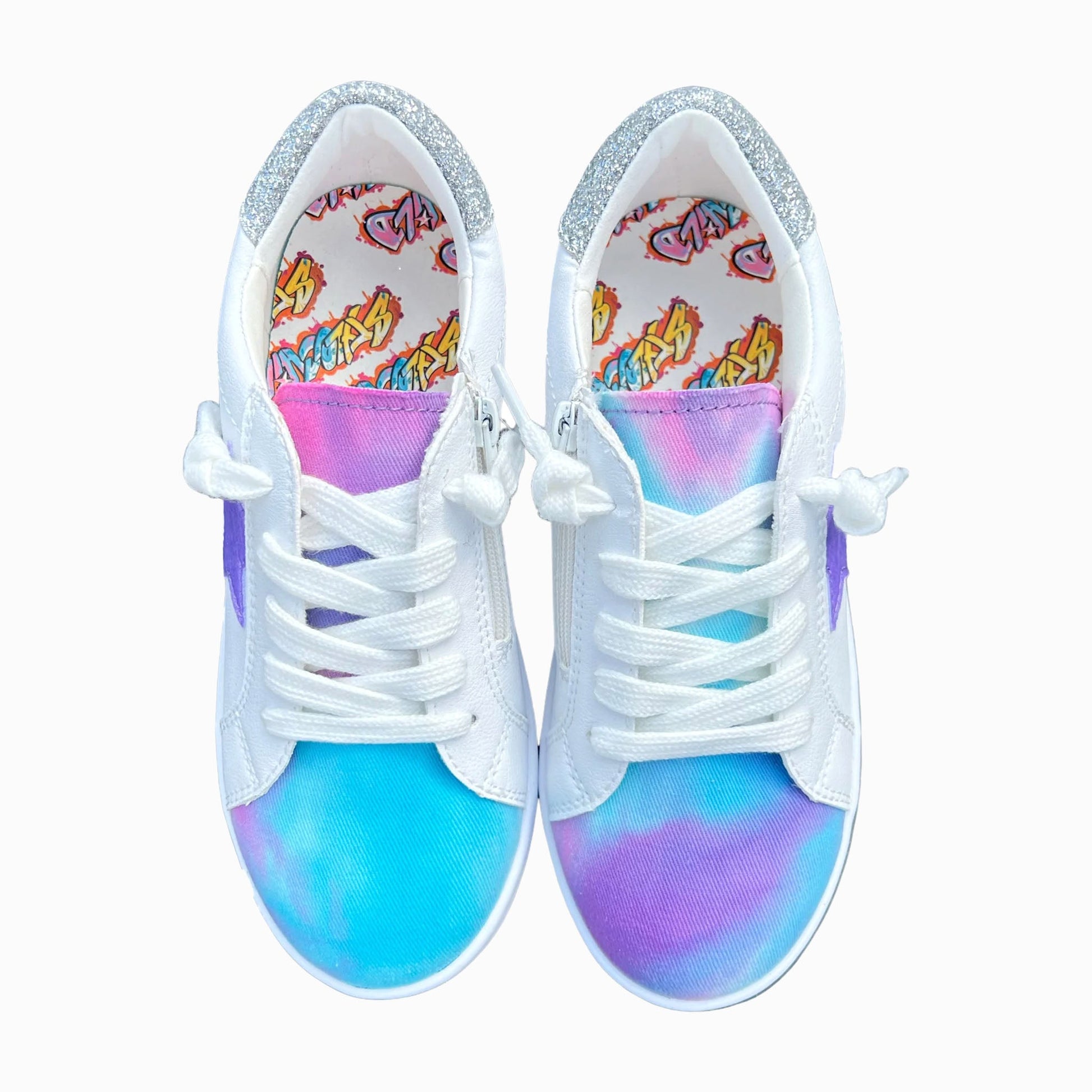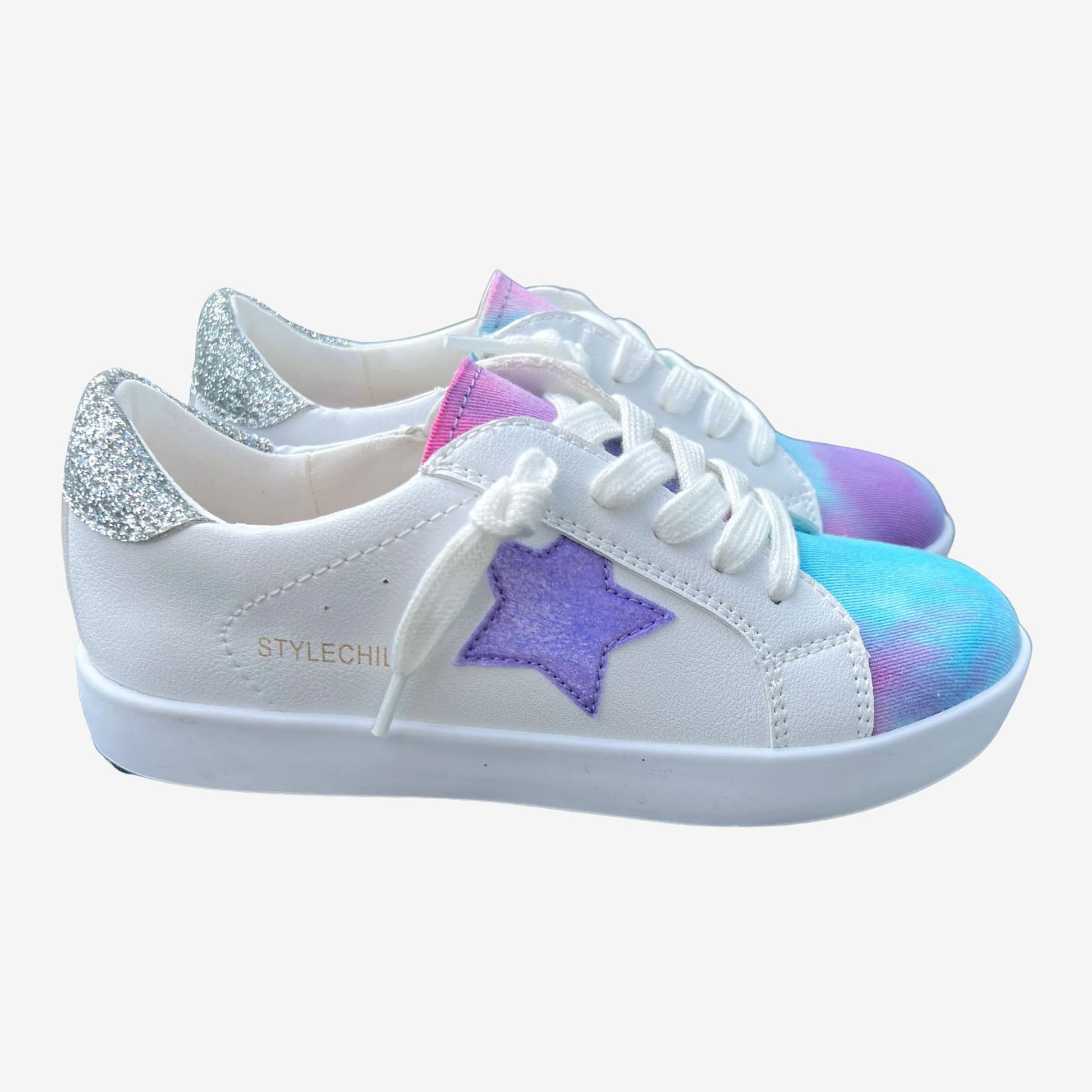 • White PU leather upper; canvas tie dyed toe and tongue (color will vary on each sneaker), purple glitter star with silver glitter heel grip