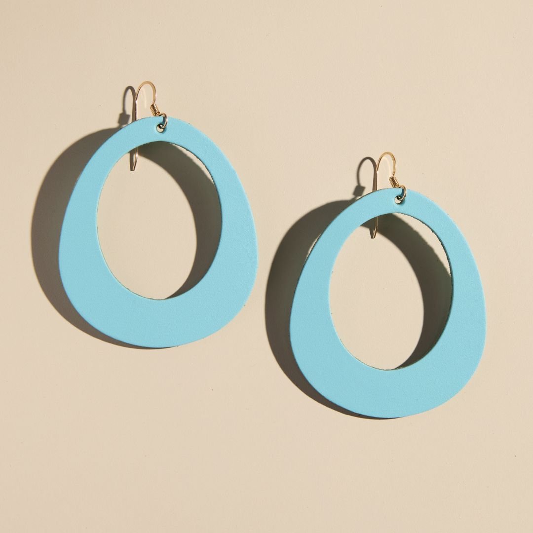 Willows are lightweight statement earrings inspired by organic shapes. These leather earrings are available in two sizes and feature smooth, light blue Lagoon leather on 14k gold filled ear wires.