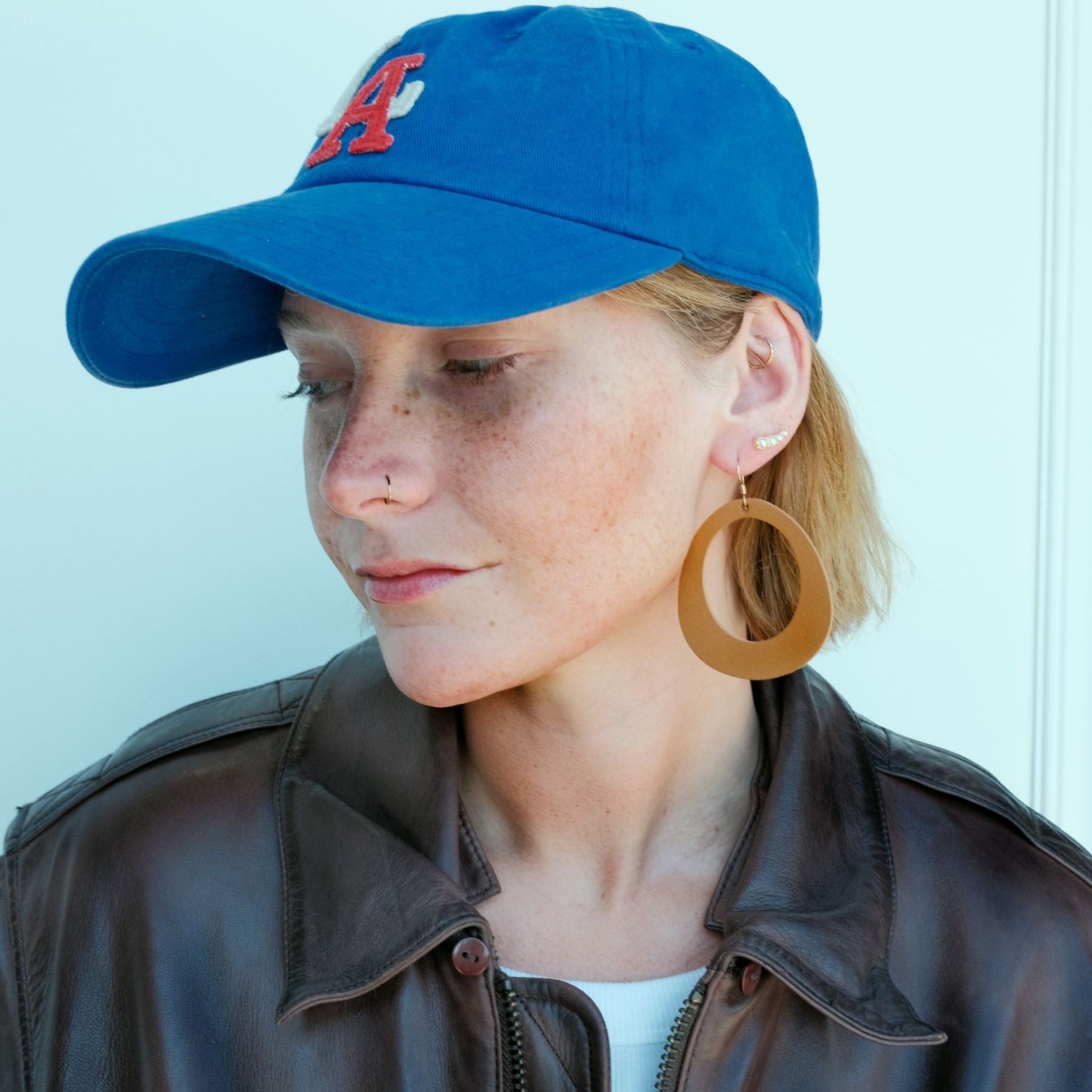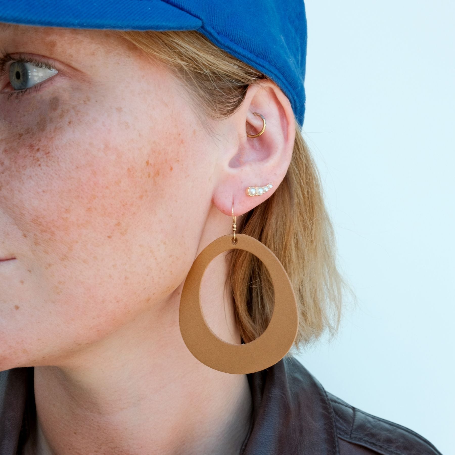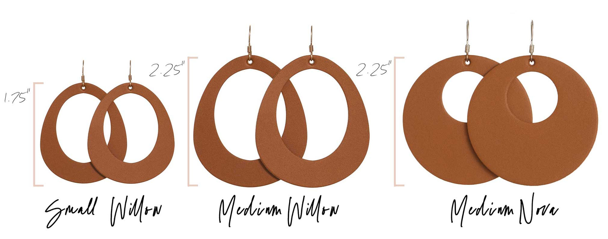 London Tan is a smooth matte leather in a wearable neutral brown hue. Our Willow statement earring is a round design inspired by organic shapes. Available in two sizes.
