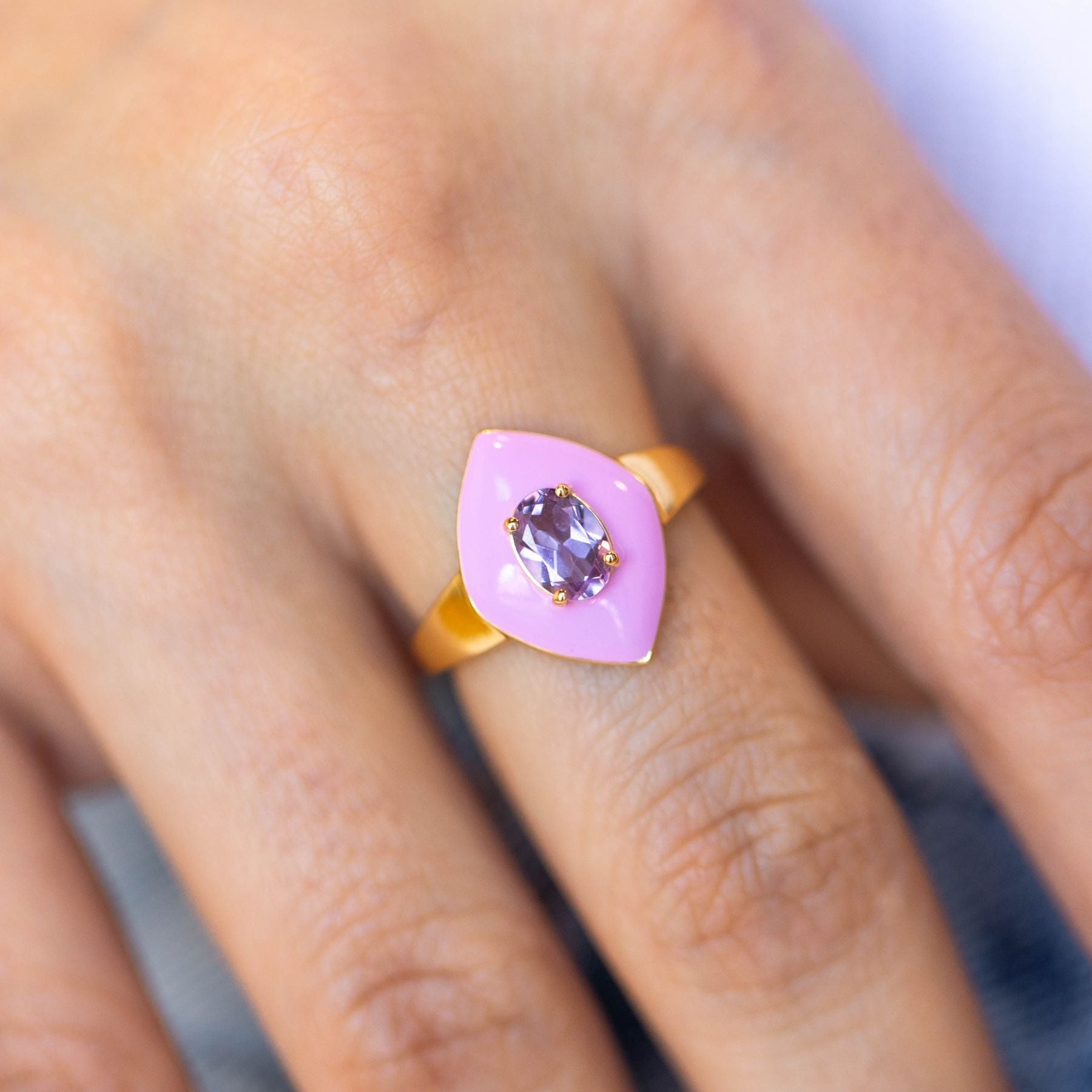 This stunning gold ring features a diamond-shaped pink enamel piece with genuine amethyst stone at its center. This luxe design is elegantly crafted from 14 karat gold plating over sterling silver.