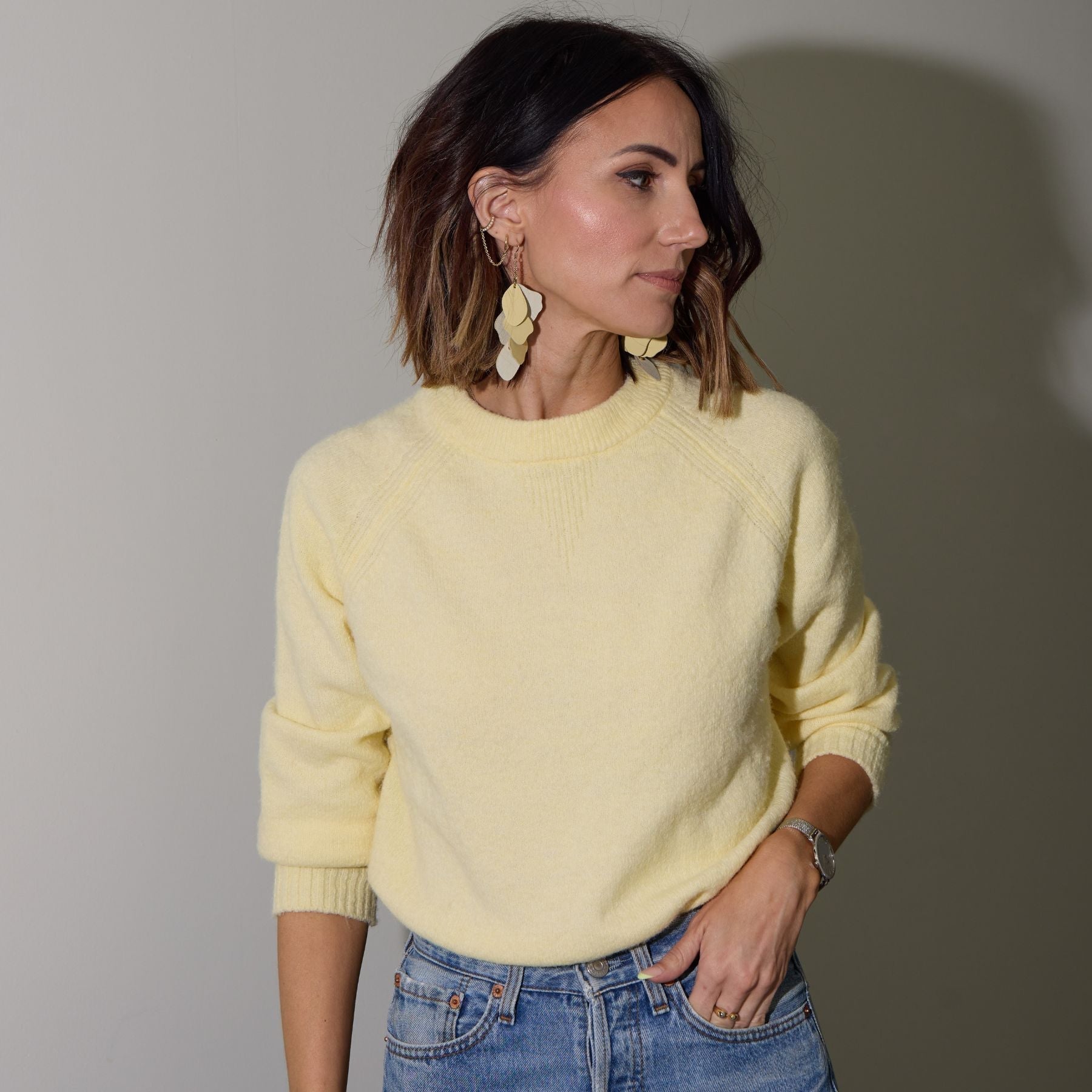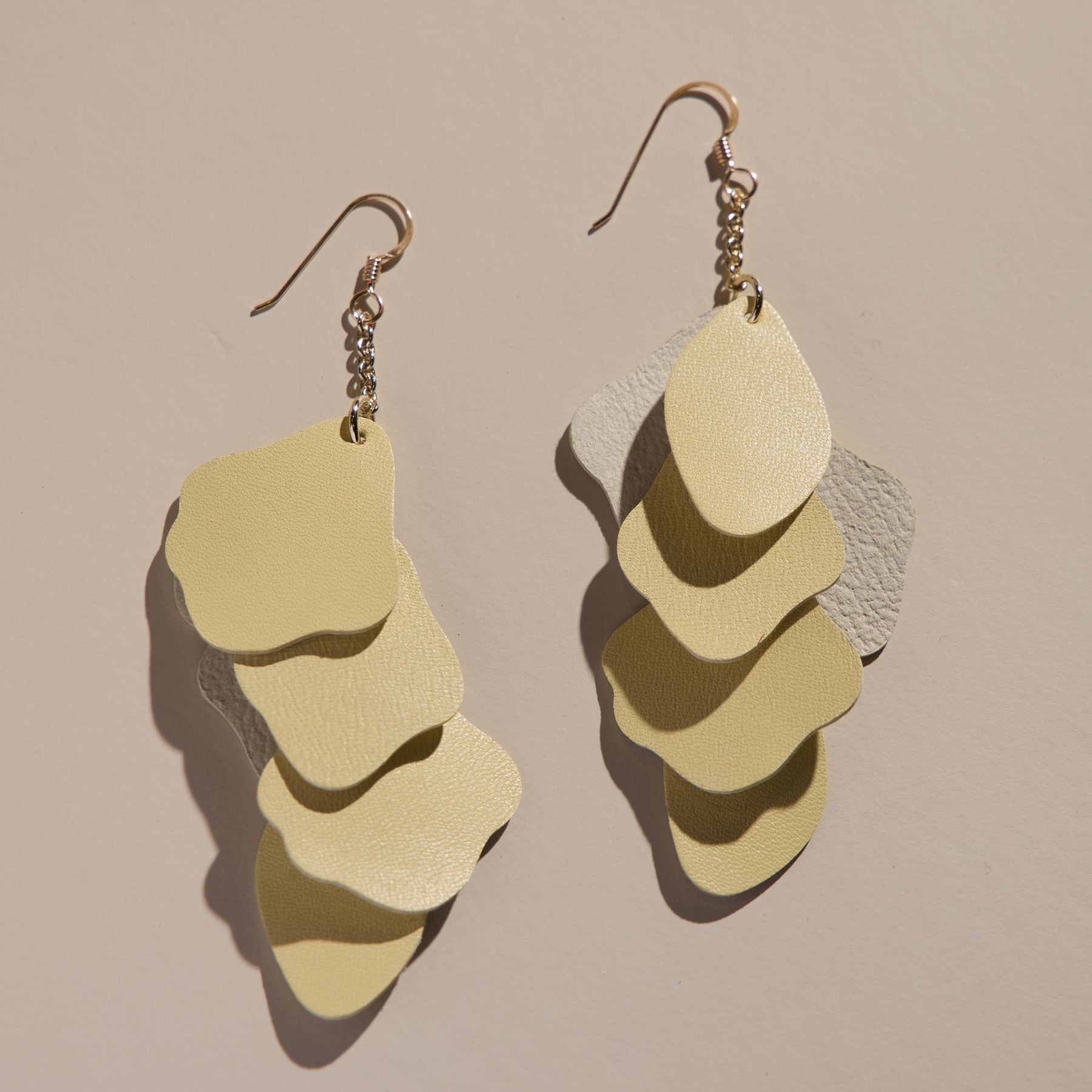 Florence is a statement earring that makes the perfect finishing touch to any ensemble. Crafted with soft, meringue-yellow Nappa leather attached to gold chains, this versatile piece will go with anything.