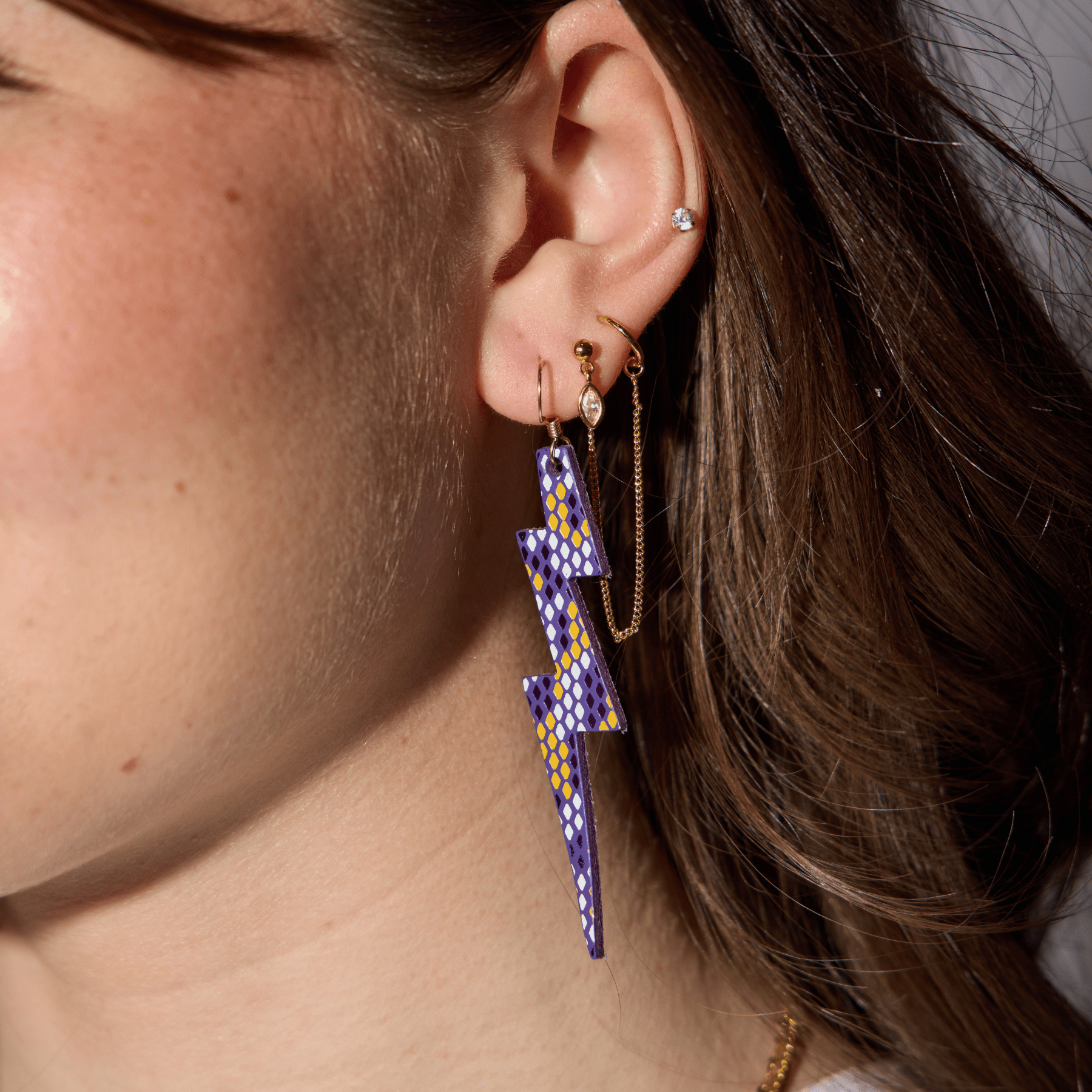 Get Thunderstruck with our Minnesota Lightning Bolts - our iconic bolt silhouette that features our smooth purple leather that is hand-stamped with white and yellow-gold iridescent foil in a snake-skin pattern.