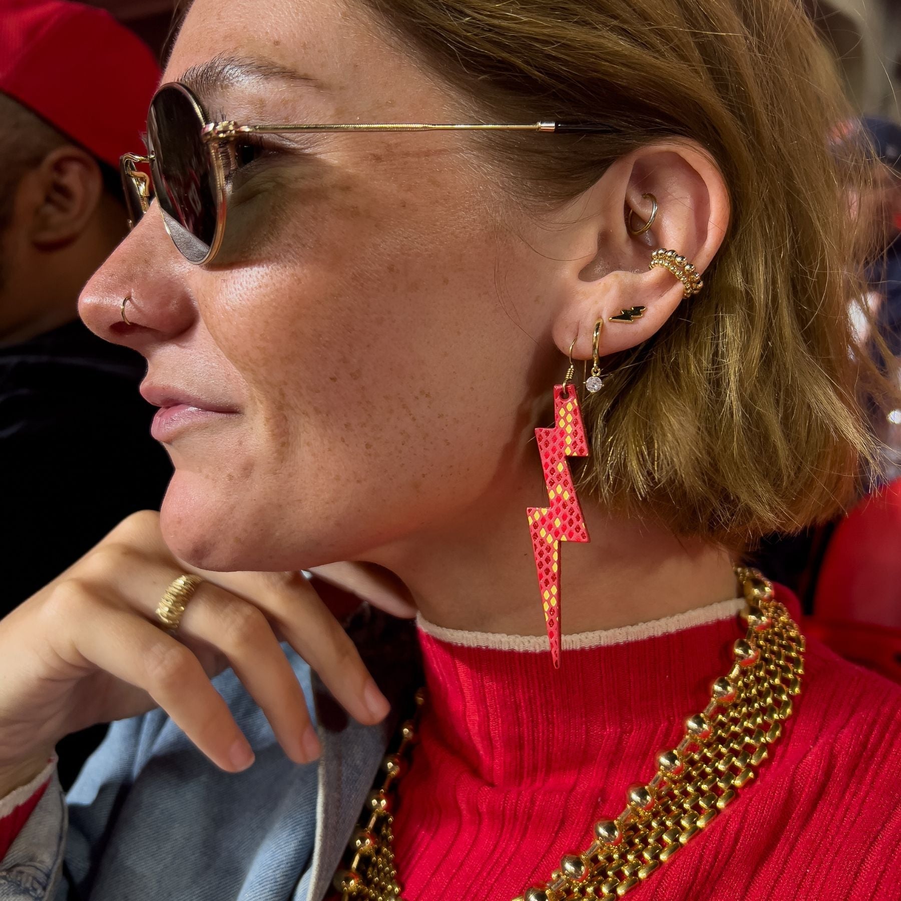 Get Thunderstruck with our KC Lightning Bolts - our iconic bolt silhouette that features our smooth crimson leather that is hand-stamped with metallic red and gold iridescent foil in a snake-skin pattern.