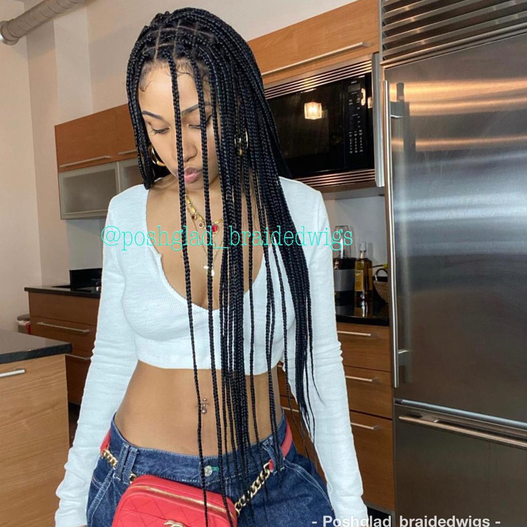Introducing our scalp-looking glueless shade knotless braided wig handcrafted from 100% Human hair on a top-quality Swiss full lace. This premium wig features 3-4 combs, an adjustable rubber band, and a snap hook for a secure and hassle-free installation. With the proper care, this wig is designed to last between 2-3 years. Poshglad Braided Wigs - the perfect braided wigs for any occasion