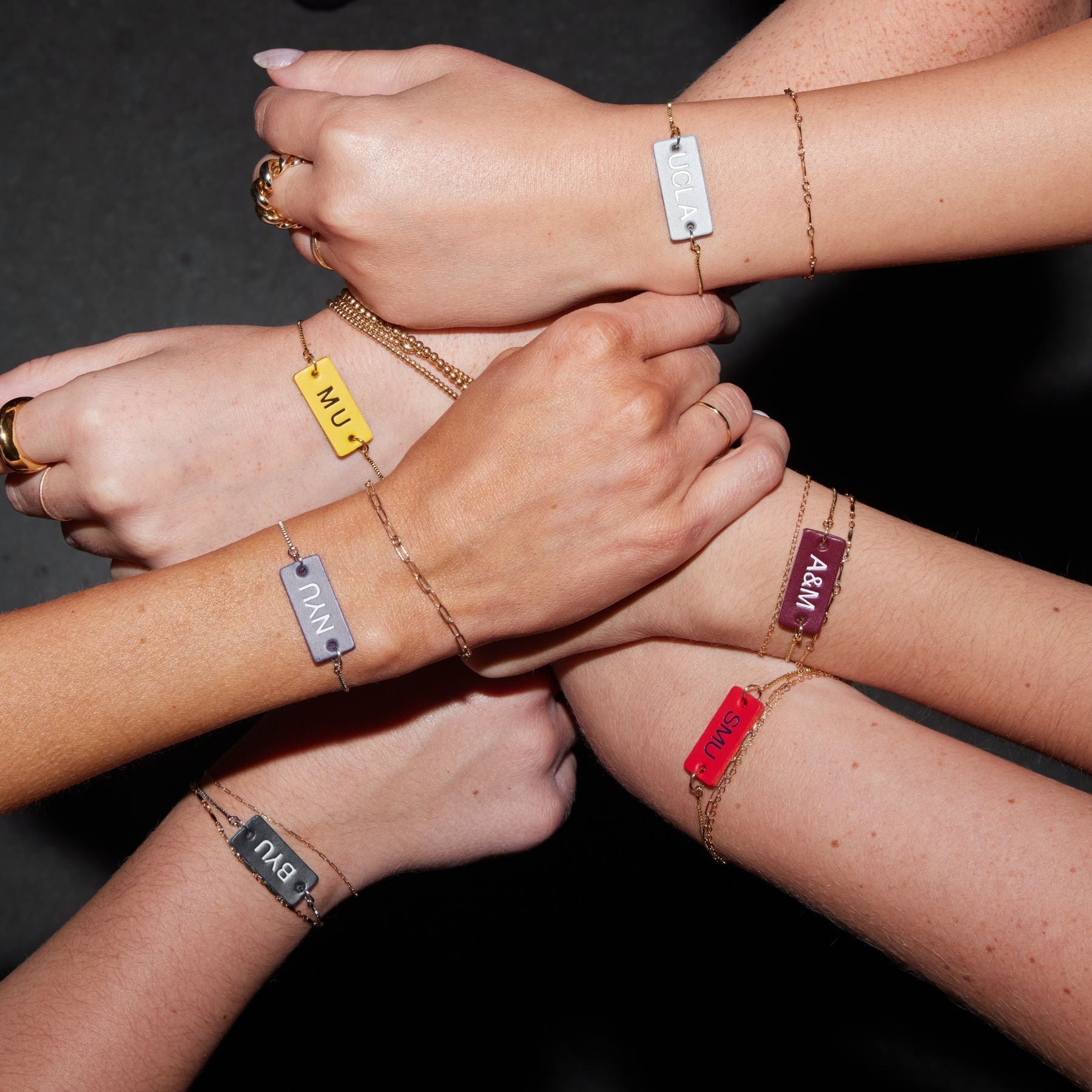 Simply choose your bracelet leather color, then use the four drop down menus on this page to choose up to four characters to be monogrammed onto your bracelet! Next, select your foil color. Character options are letters A-Z, numbers 0-9, a heart, a star, and an ampersand. *Disclaimer: No more than three special characters (heart, star, ampersand) can be fit on a bracelet next to each other.