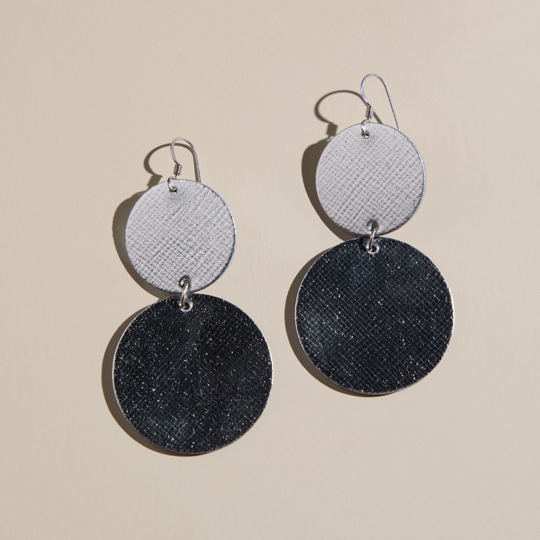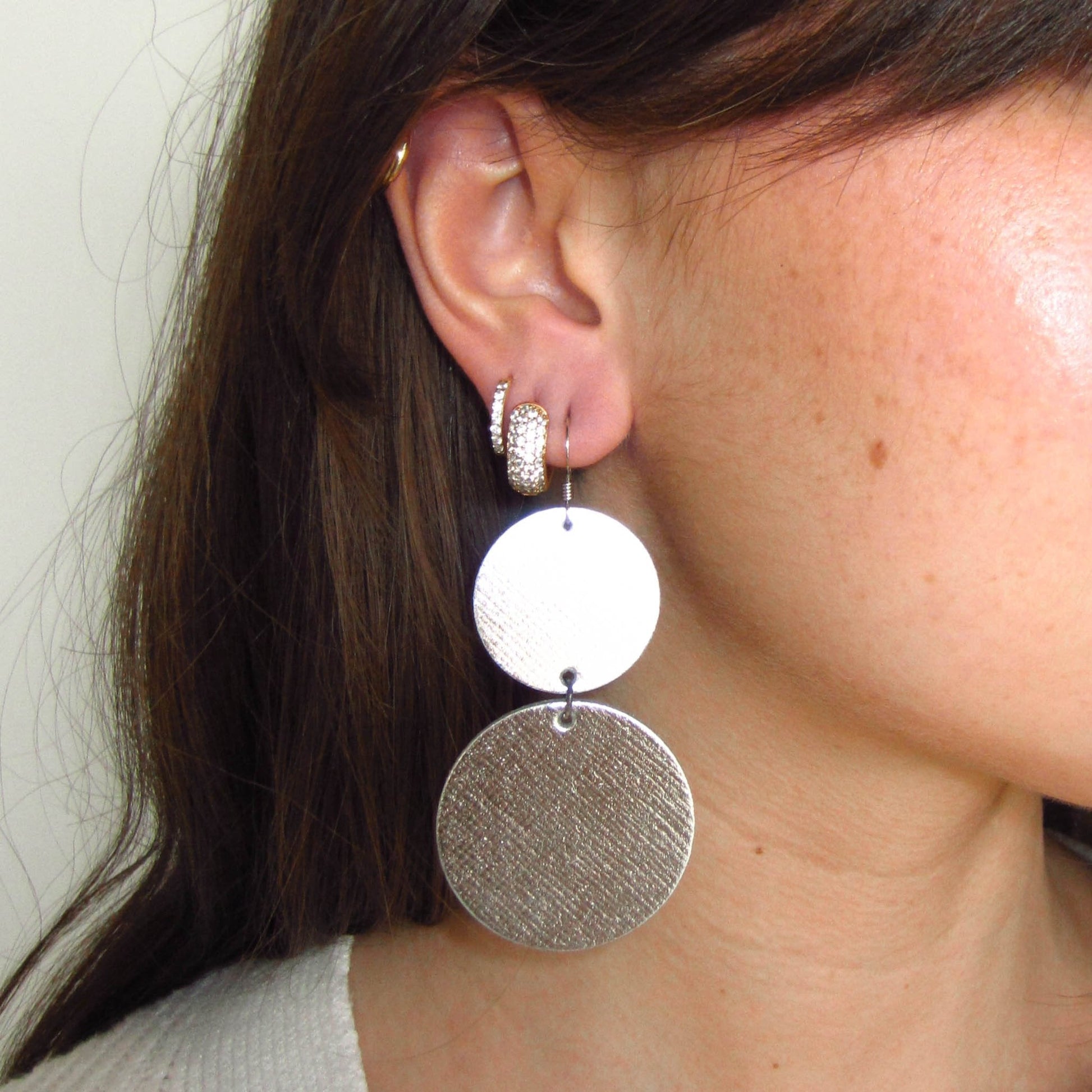 Go big with our bold Devon in Silver Leaf leather. Featuring a fun circular silhouette, these statement earrings have the right balance of motion and weightlessness.