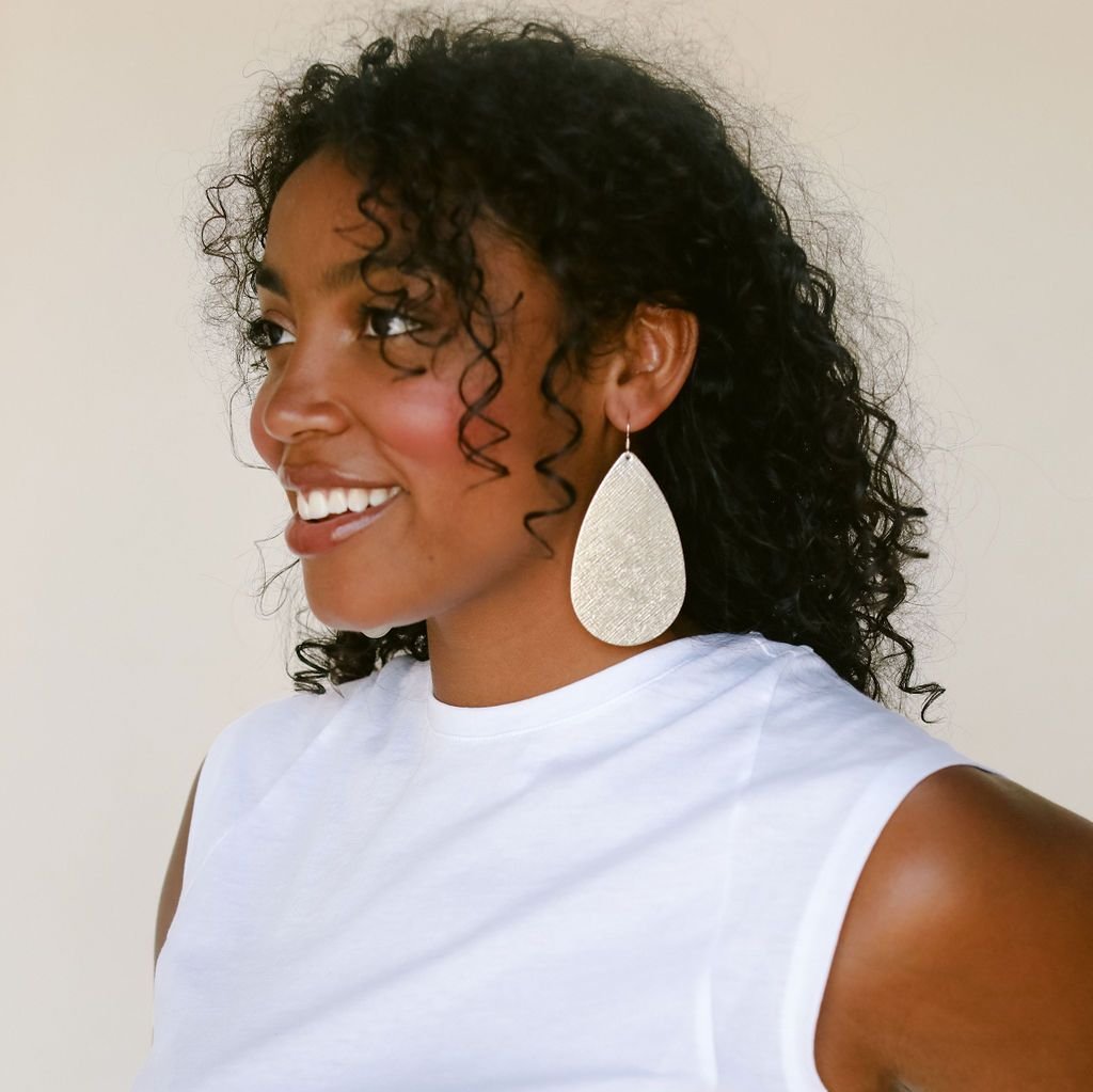 This best-selling style features metallic silver leather with a crosshatch texture. These lightweight statement earrings offer the classic look of cool silver with the ease and comfort of leather.