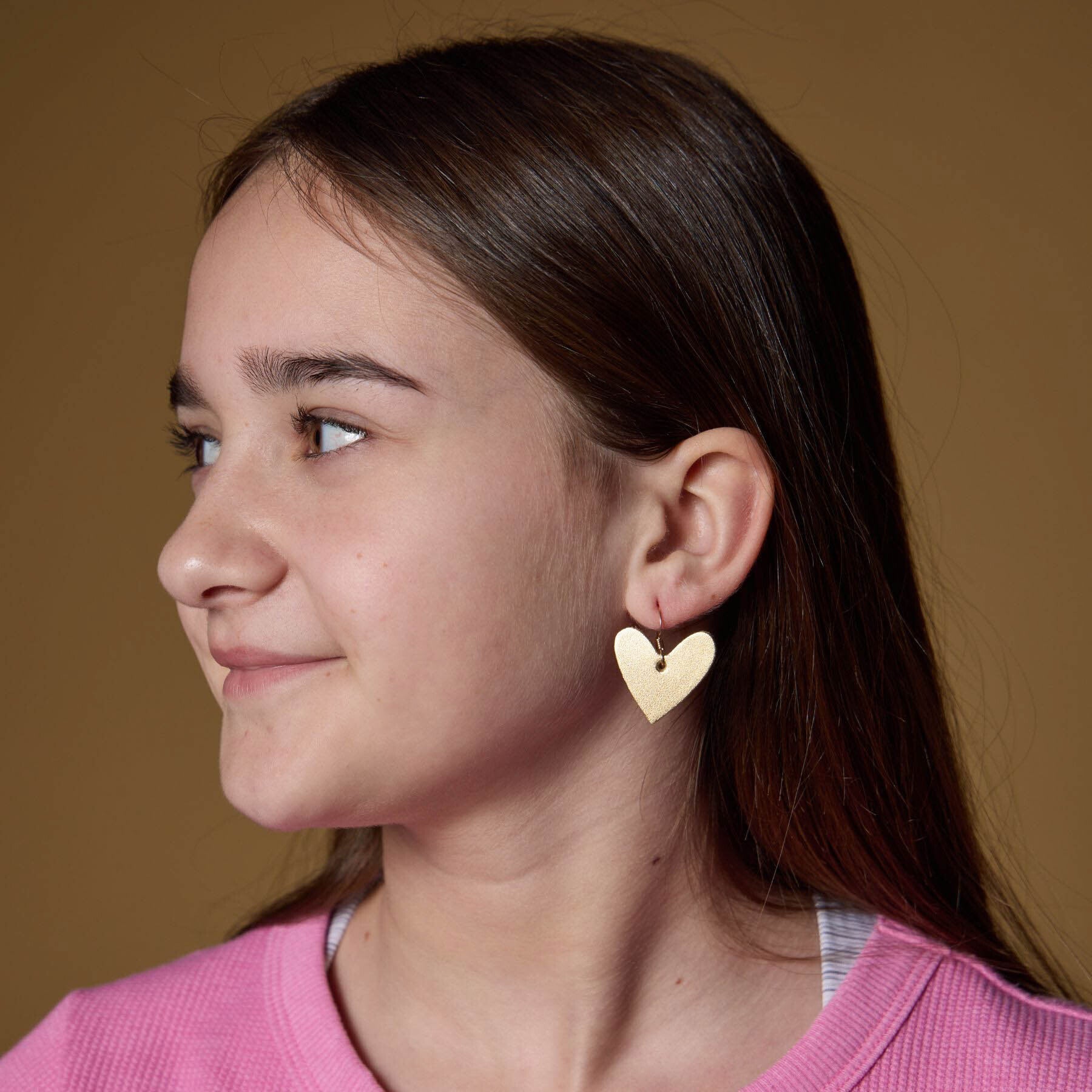 The minnie is a dainty heart shaped drop earring inspired by our Milas and patented Sweetheart hoop earring design. These lightweight earrings feature Silver Satin leather attached to a rhodium component.