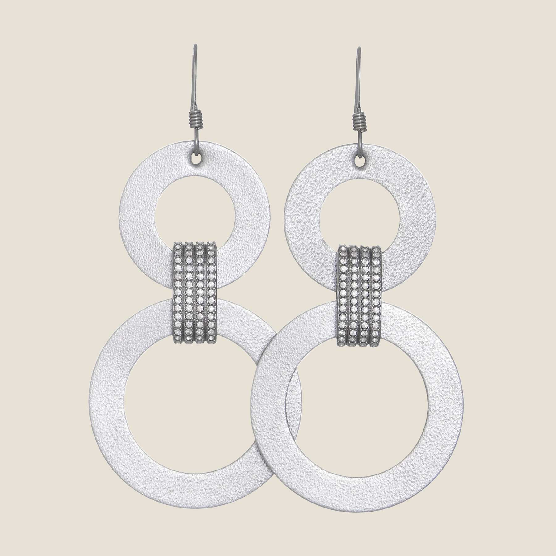 Silver Satin Skyline Sloanes have two leather circle cut-outs in our metallic silver leather. This update to our bestselling statement earring features a silver accent piece studded in rhinestones.