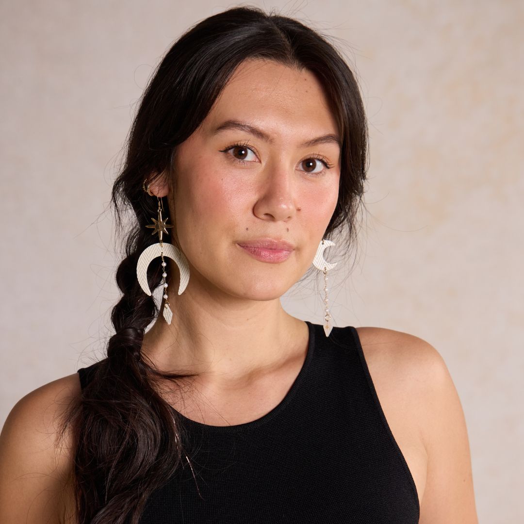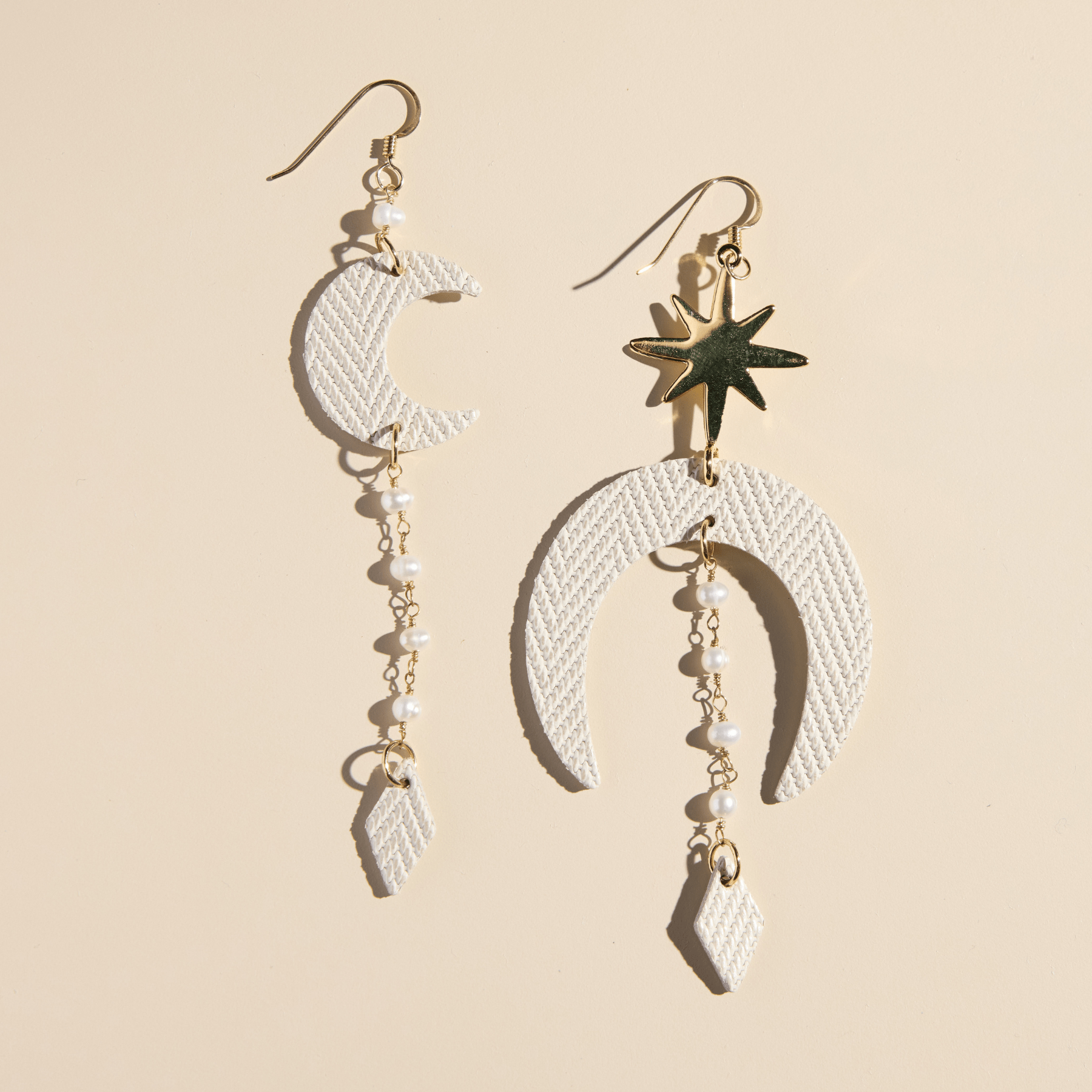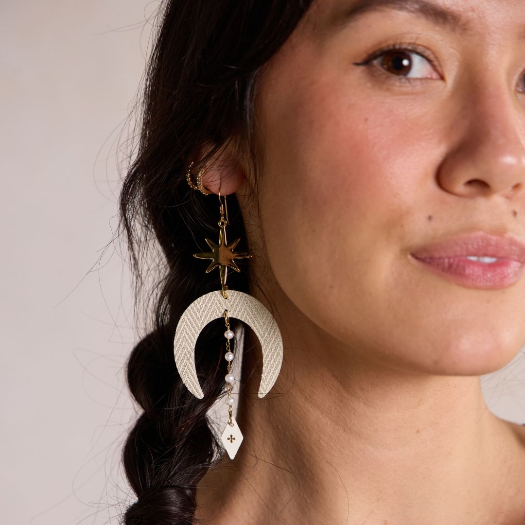 Adorn your ears with the artfully elegant Astra earrings. Crafted from premium Italian leather and detailed with authentic freshwater pearl beadwork and a radiant sun pendant piece, these elevated asymmetrical drop earrings are sure to make a statement with every ensemble.