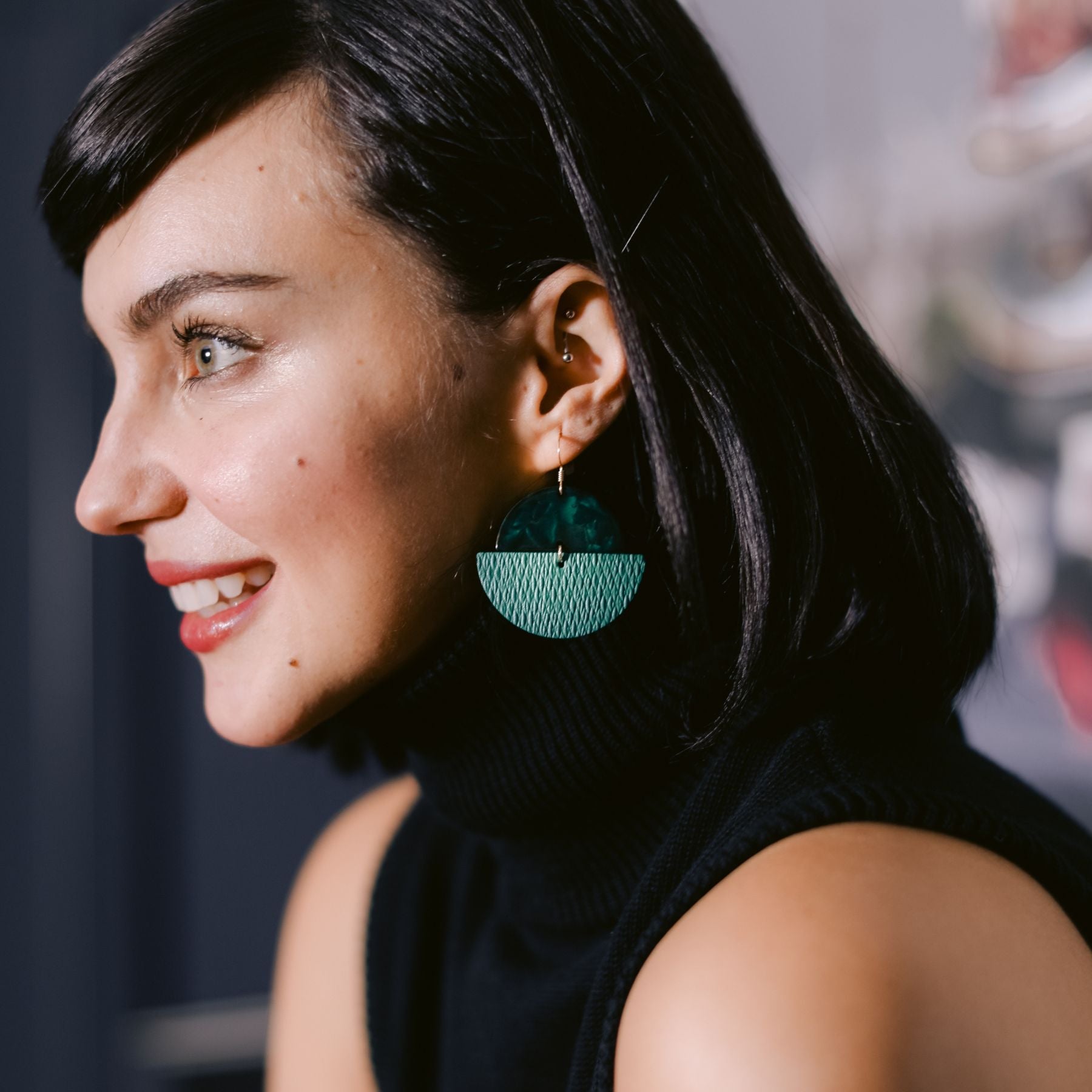 Our dramatic and bold new Lunas is sure to spruce up any ensemble. Smooth, shiny dark green marbled resin, and lightweight, fine-grain Spruce leather come together for this bold favorite you can wear year-round.
