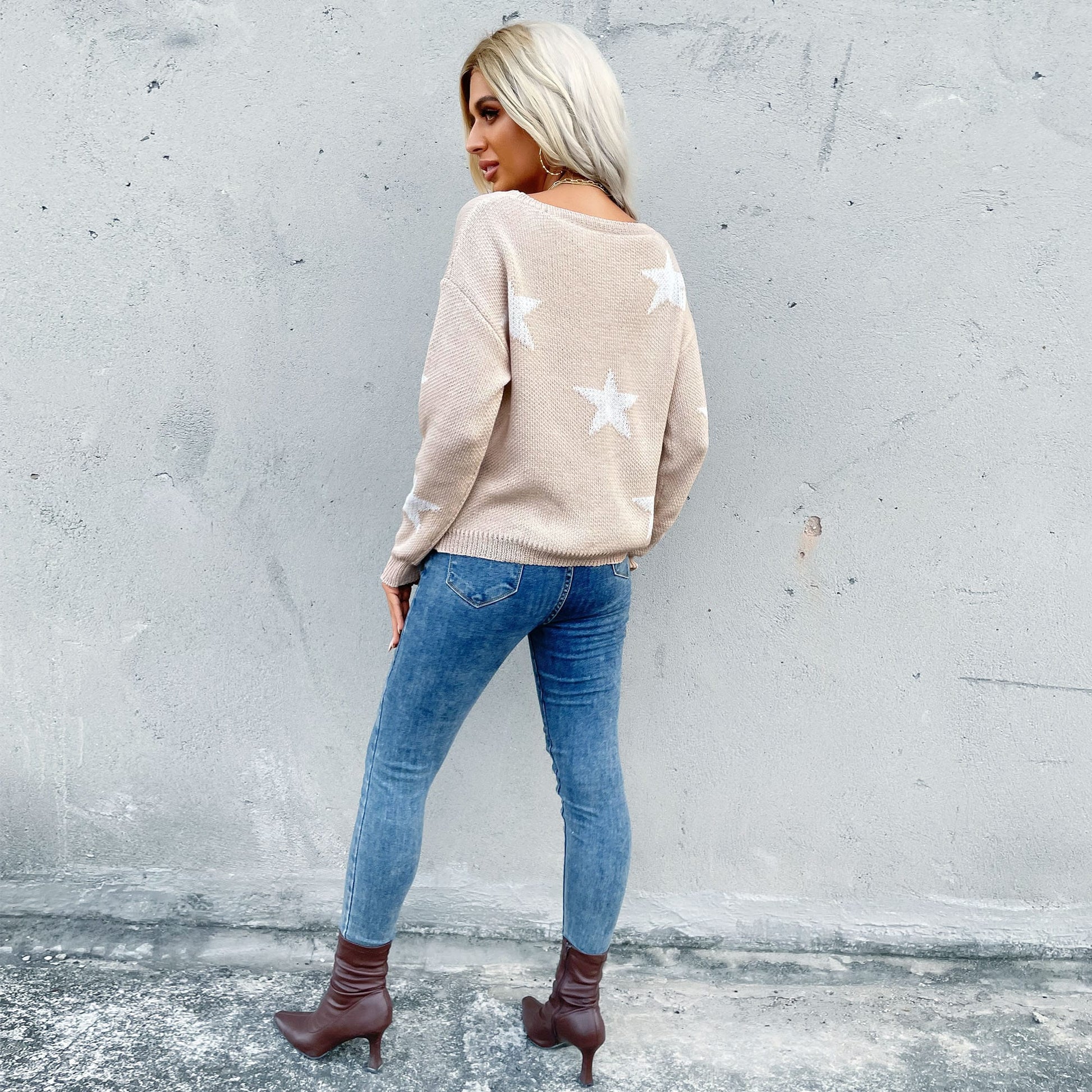 ??he Anna-Kaci sweater is detailed with a unique distressed hem design that adds an edge to this look. Features a star print design, round neck line, drop shoulder, long sleeves, and relaxed fit. Pair it with a hat and your favorite denim jeans for an easygoing look.