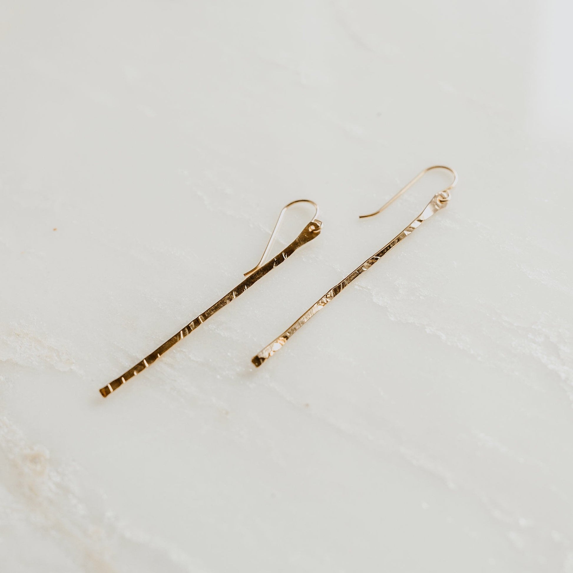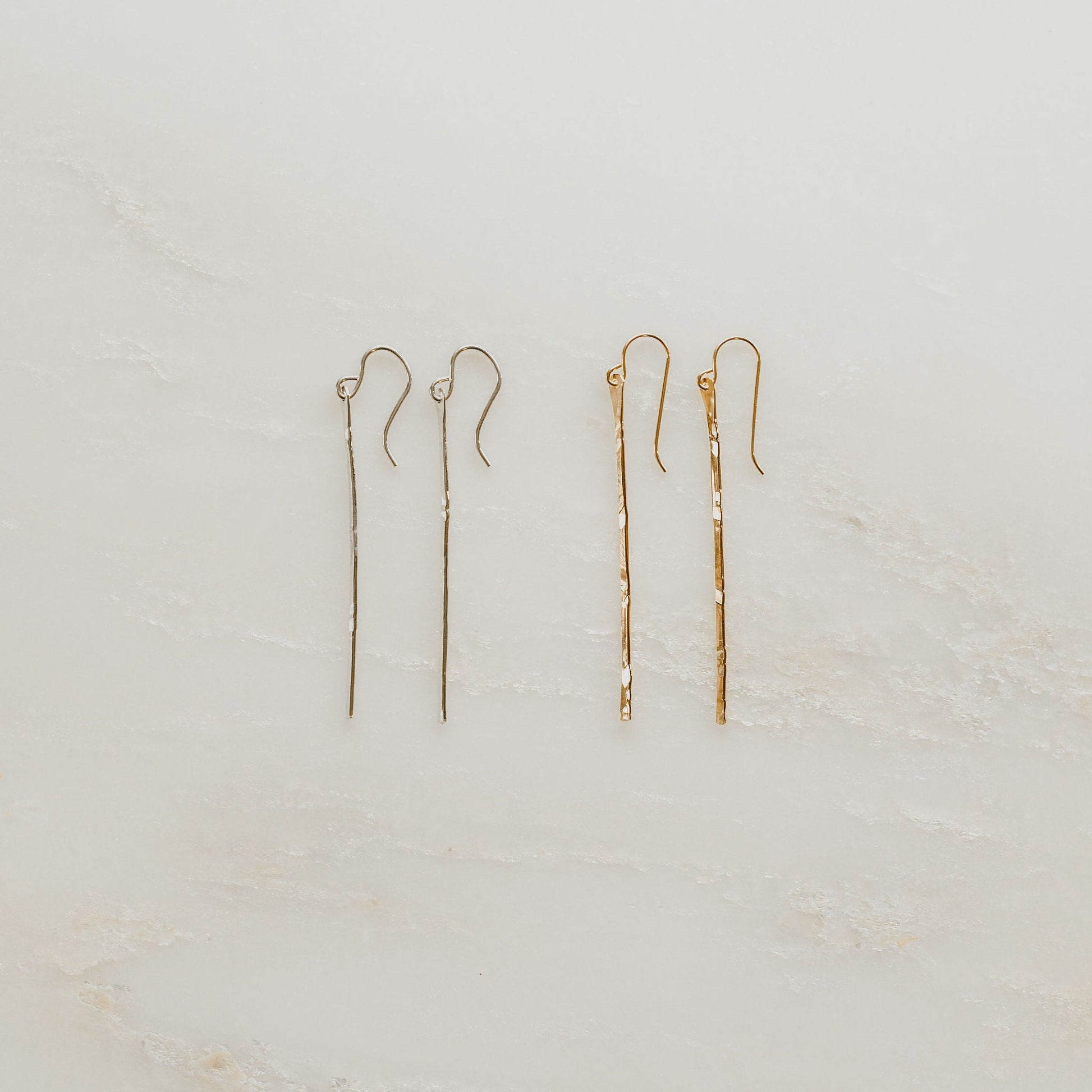 Hand hammered and textured stick earrings. Minimalist and just right to go with any look.