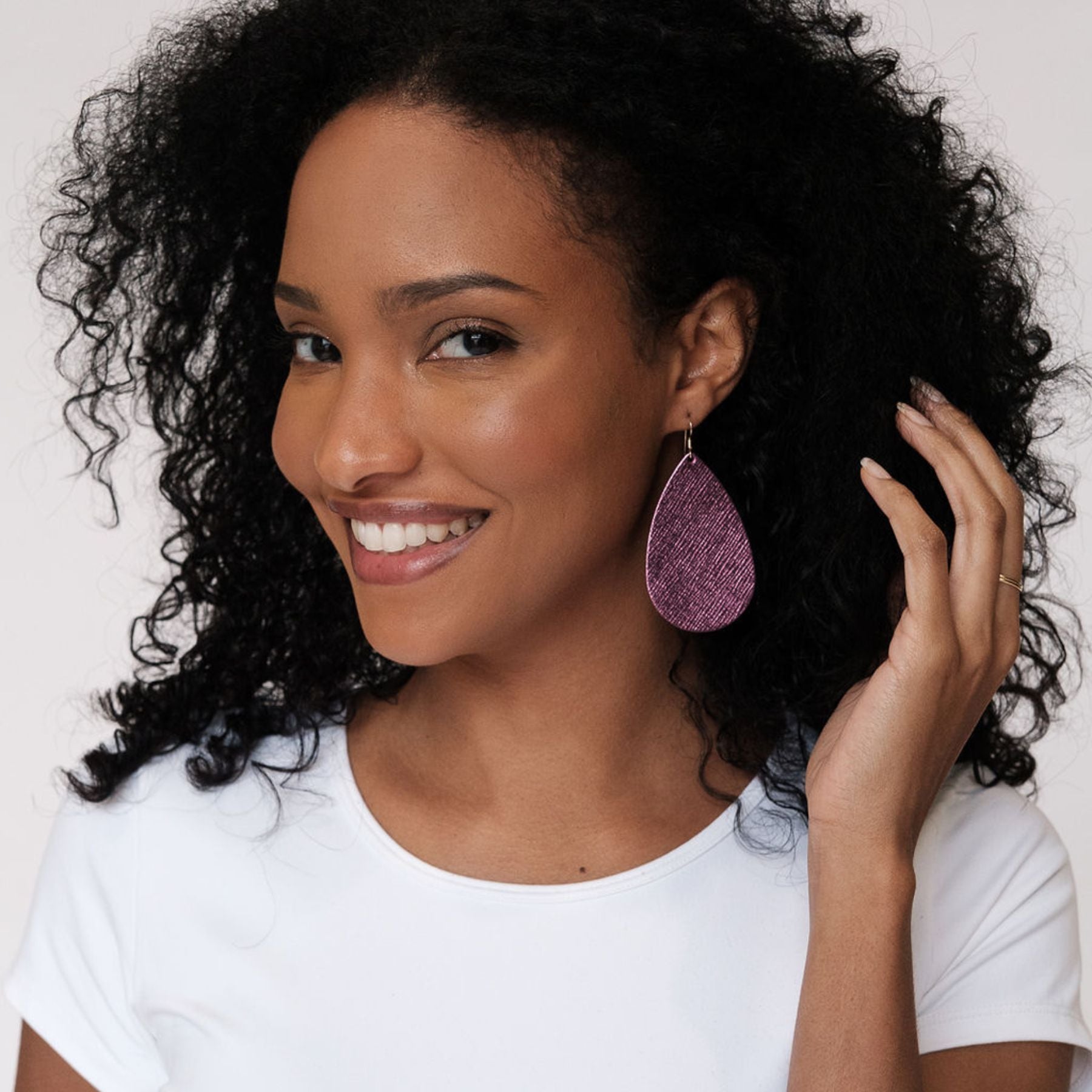 Sugar Plum is a warm-toned purple leather that features a sparkling, shimmering texture. The backs of these lightweight earrings feature a smooth, matte purple finish.