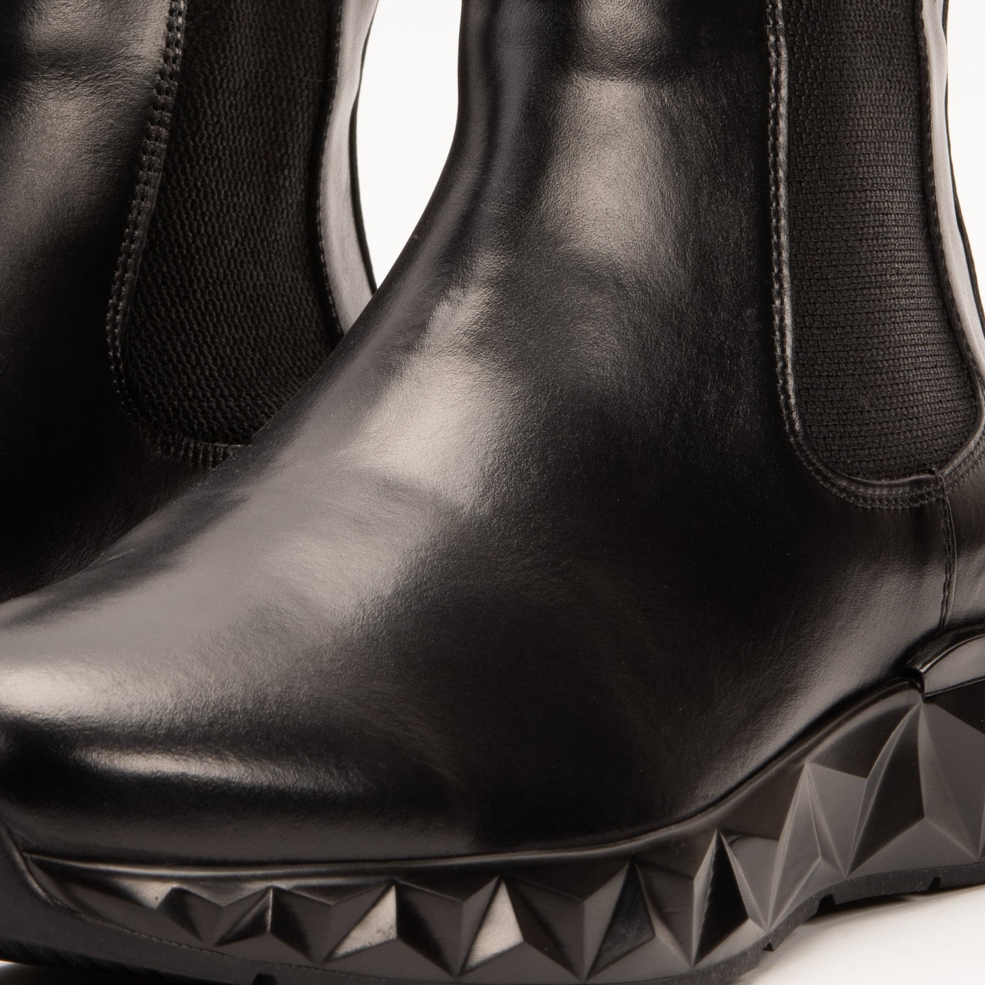 - Crafted from 100% genuine calf leather, the sleek black exterior showcases a timeless Chelsea boot design with a modern twist.