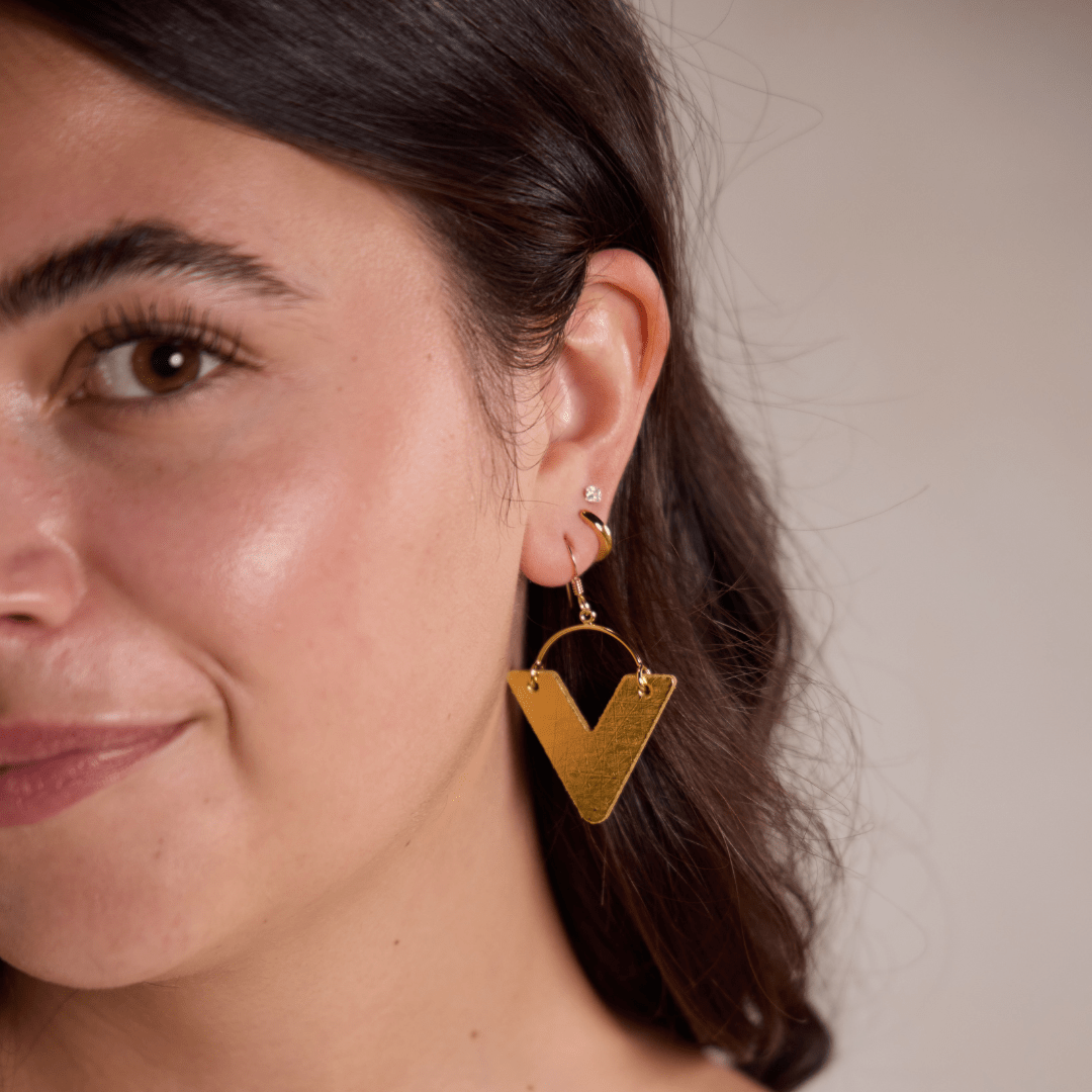 The Suttons are a lightweight geometric statement leather earring. Our Vintage Gold leather mimics the look of metal adding a classic touch to any outfit while still being lightweight.