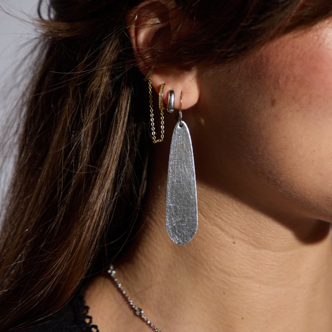 Timeless style meets a slim, face-framing silhouette... introducing the Vintage Silver Lilas. This lightweight statement earring is created with our Vintage Silver leather and rhodium hardware for the look of a metal drop earring, without the weight or discomfort.