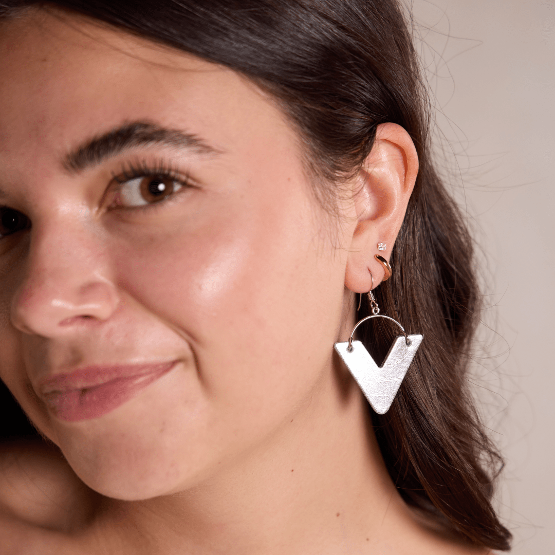 The Suttons are a lightweight geometric statement leather earring. Our Vintage Silver leather mimics the look of metal adding a classic touch to any outfit while still being lightweight.