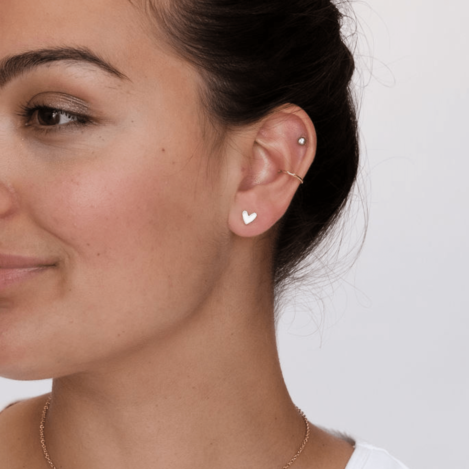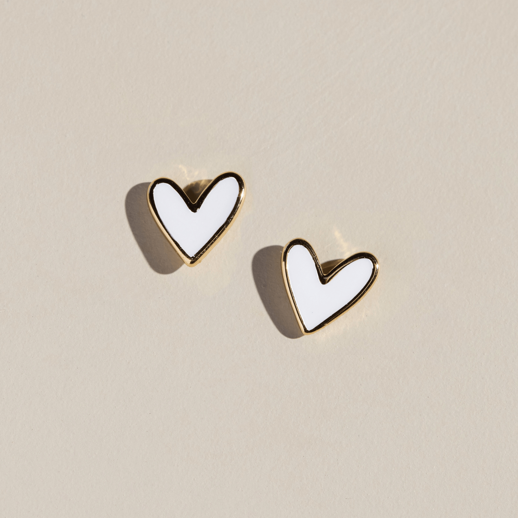 White Sweetheart Studs feature our signature heart shape, inspired by the patented Sweetheart statement earrings. These delicate stud earrings feature shiny white enamel with gold detailing.