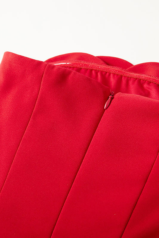 Details-Dimensional floral embellishments blossom, 3D floral accent, Strapless, Structured corset bodice, Back zip closure.
