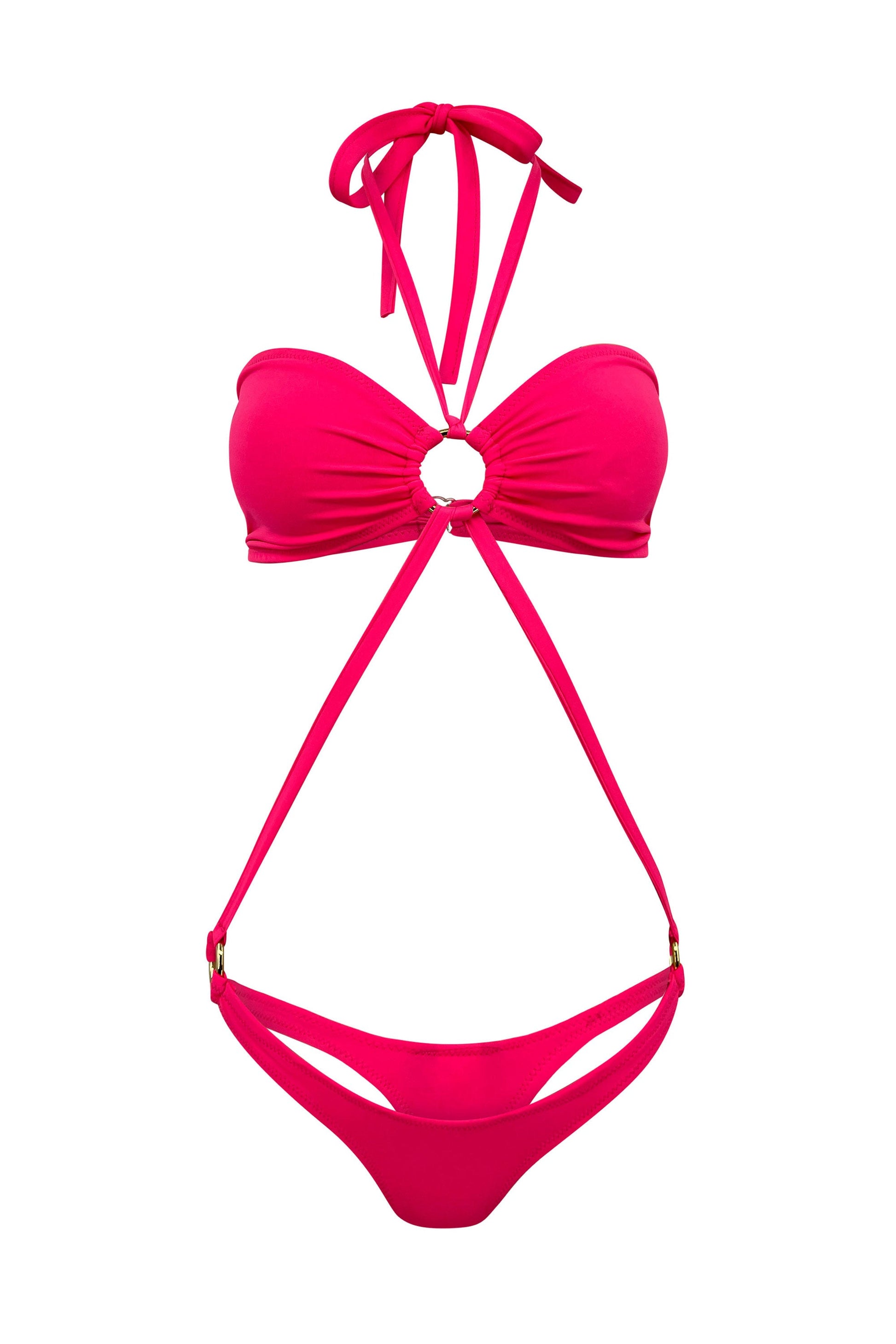 The Yazmin One-Piece Bikini stands out with its vibrant neon yellow or coral color and intricate, flattering design. The bandeau cups feature a gold ring detail at the center, providing both style and support. The connecting straps, adorned with gold rings, elegantly enhance your natural curves.
